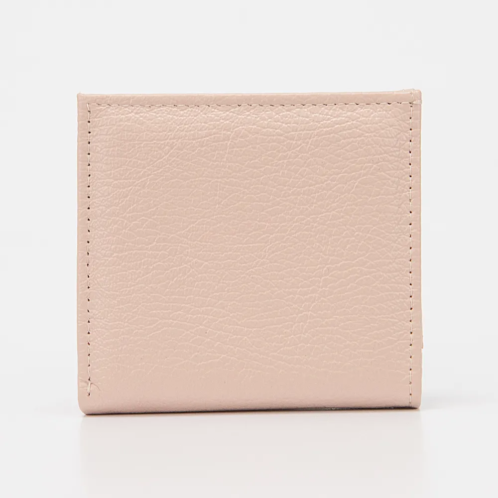 Компактный кошелек от торговой марки Poshete из натуральной кожи пудрового цвета. Модель имеет одно сложение; раскрывается книжкой, фиксируется кнопкой. Внутри: карманы для карт, карман-окошко; отделение для купюр с перегородкой. Снаружи имеется карман для монет на молнии.