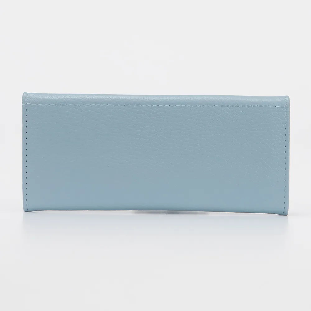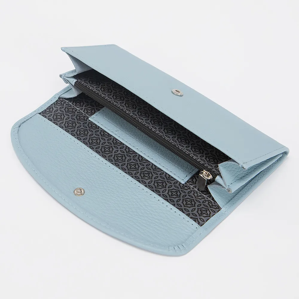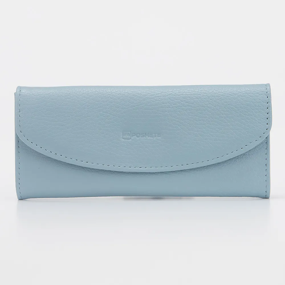 Полноразмерный кошелек от торговой марки Poshete выполнен из натуральной кожи голубого цвета. Модель застегивается закругленным клапаном на кнопке. Внутри – отделения для купюр, карманы для пластиковых карт, карман-перегородка на молнии для монет.