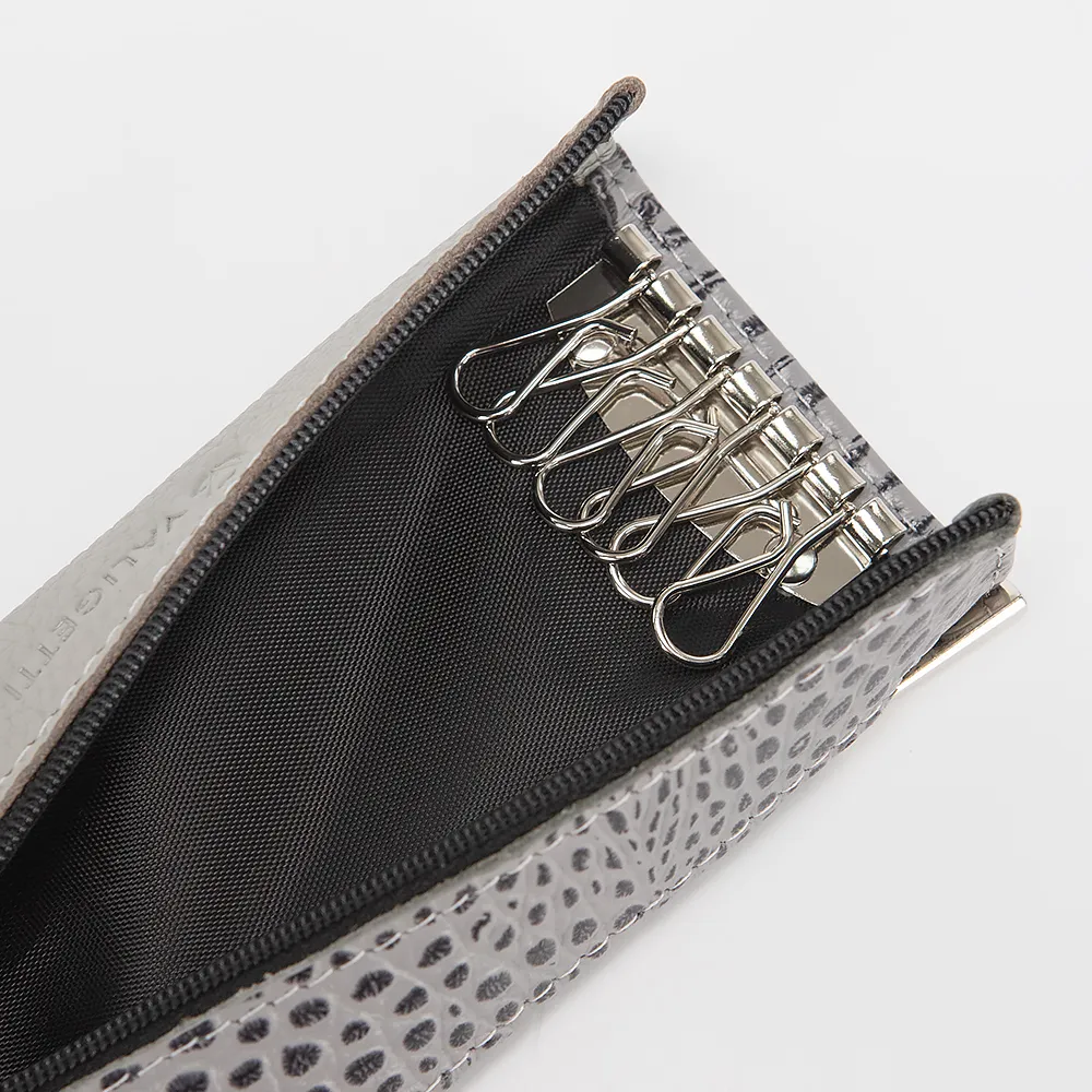 Ключница от торговой марки Valigetti из натуральной кожи серого цвета с тиснением под крокодиловую кожу. Модель закрывается молнией. Внутри: панель с шестью карабинами для крепления ключей. Снаружи карман на молнии.