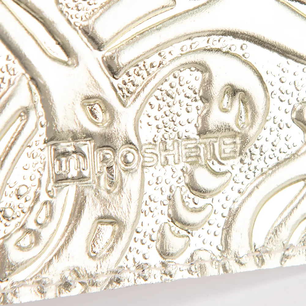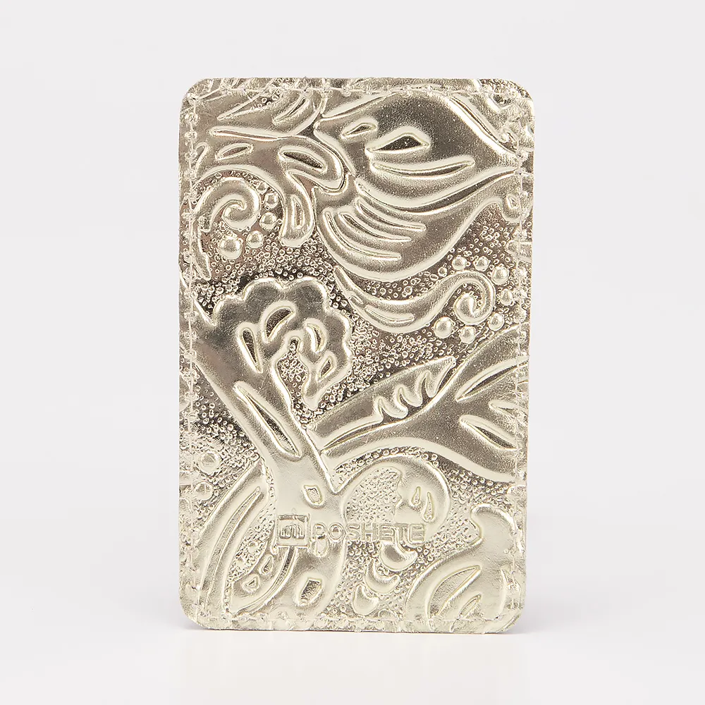 Картхолдер от торговой марки Poshete из натуральной кожи золотого цвета с узорчатым тиснением. Модель с прозрачным окошком.