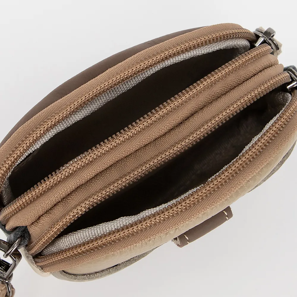 Миниатюрный кошелек от торговой марки Poshete выполнен из натуральной кожи бежевого цвета. Два отделения на молнии.