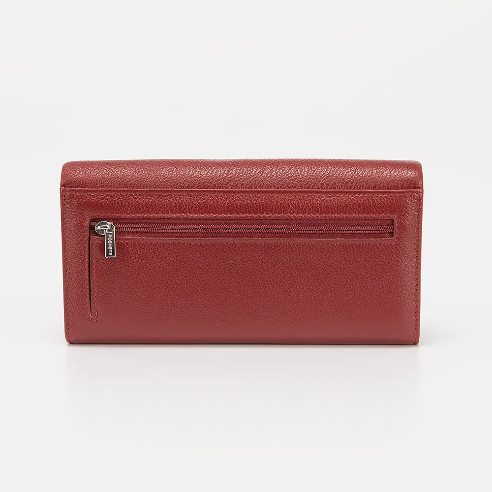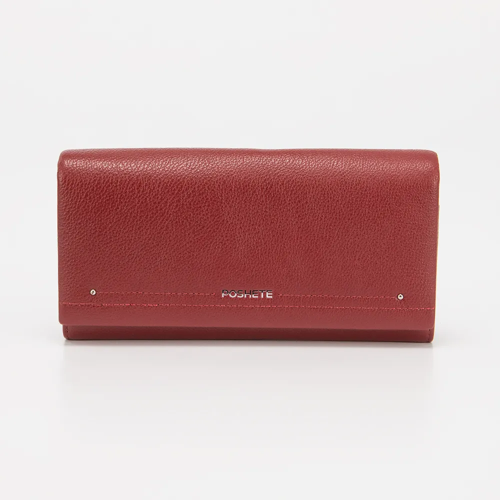 Полноразмерный кошелек от торговой марки Poshete изготовлен из натуральной кожи красного цвета. Закрывается клапаном. Внутри: отделения для купюр, карман на молнии, карманы для карт. Снаружи на задней стороне - карман на молнии.