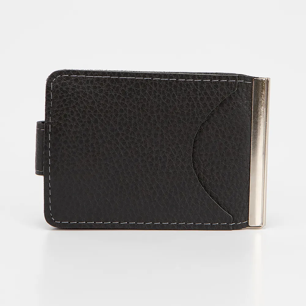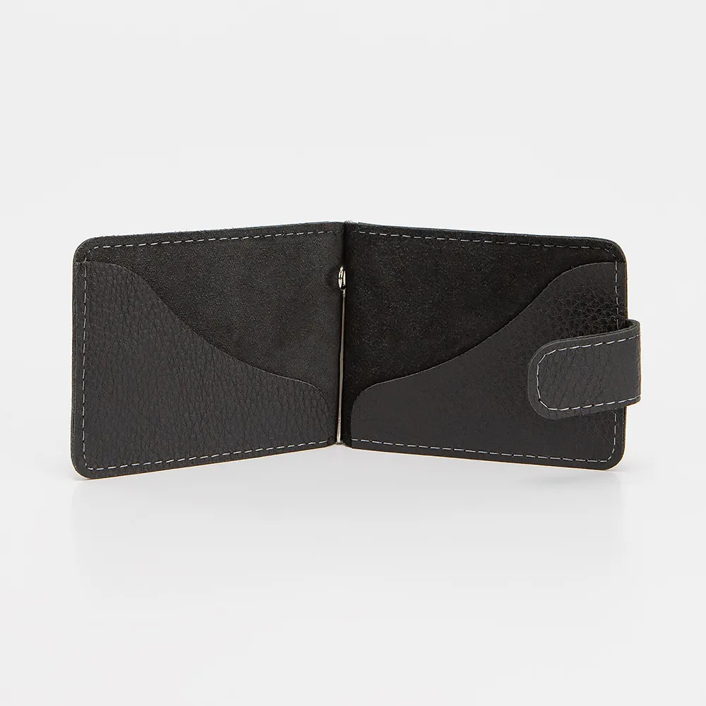 Зажим для денег от торговой марки Poshete из натуральной кожи черного цвета. Модель закрывается хлястиком на кнопку. Раскрывается книжкой. Внутри: металлическая скрепка-зажим для купюр, карманы для карт. На задней стороне - карман для карты.