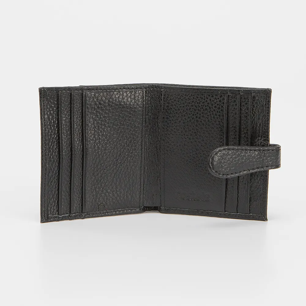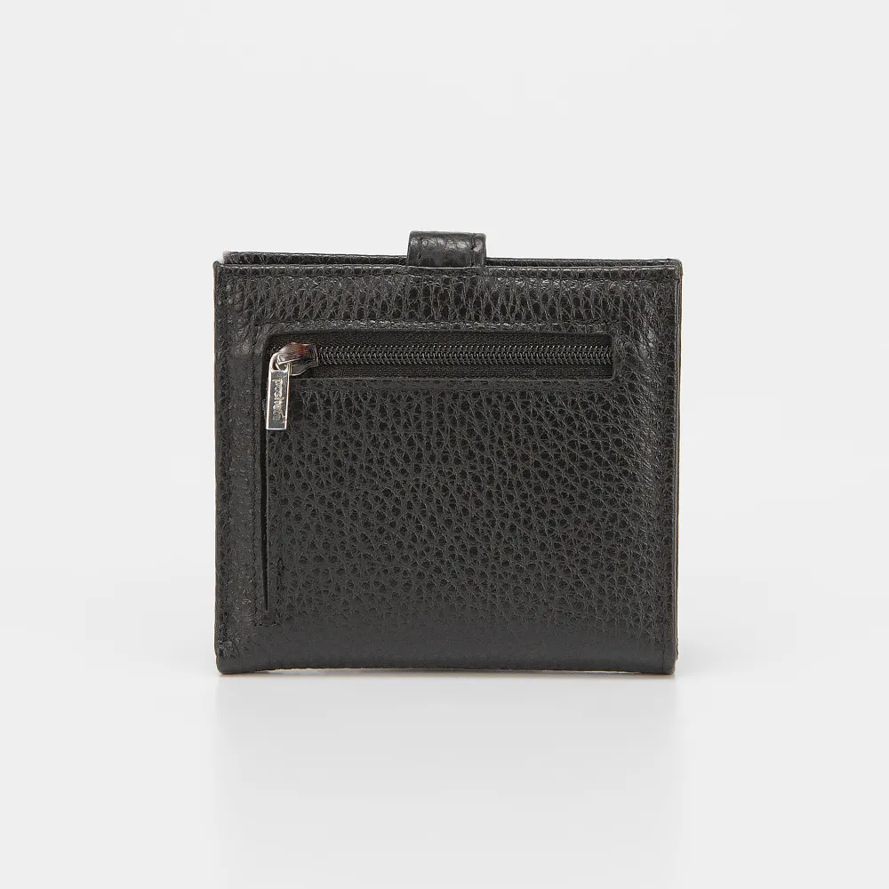 Кошелек от торговой марки Poshete из натуральной кожи черного цвета. Закрывается хлястиком на кнопку, раскрывается книжкой. Внутри: отделение для купюр, карманы для карт. На лицевой стороне снаружи - три кармана для карт. На задней стороне - карман на молнии для монет.