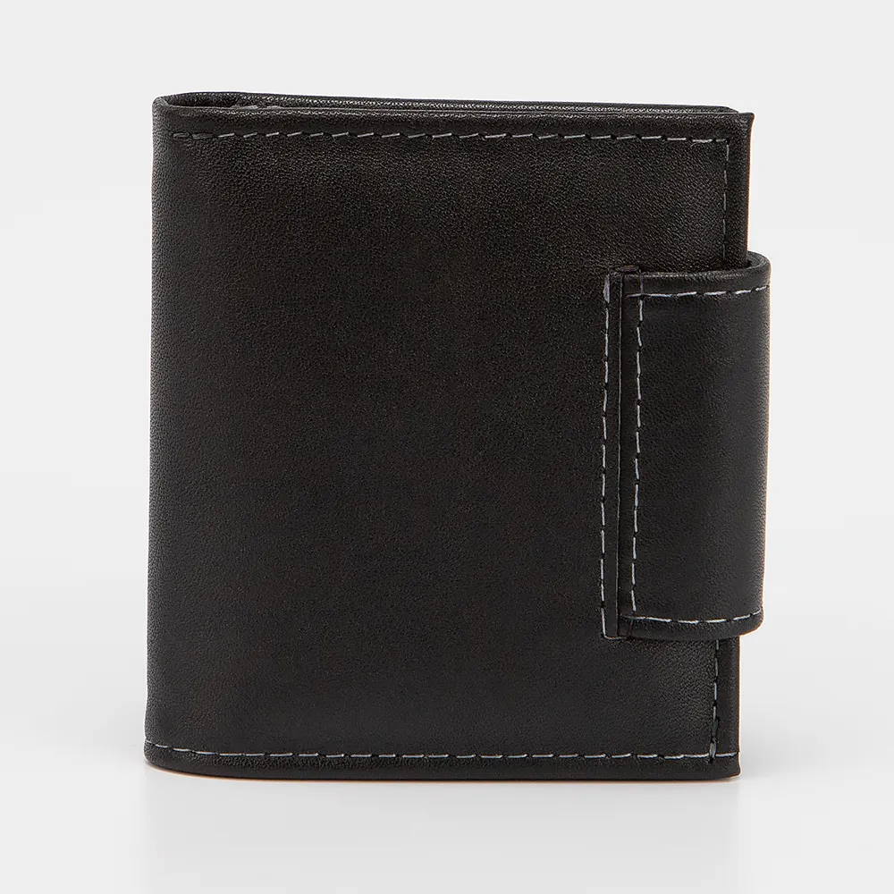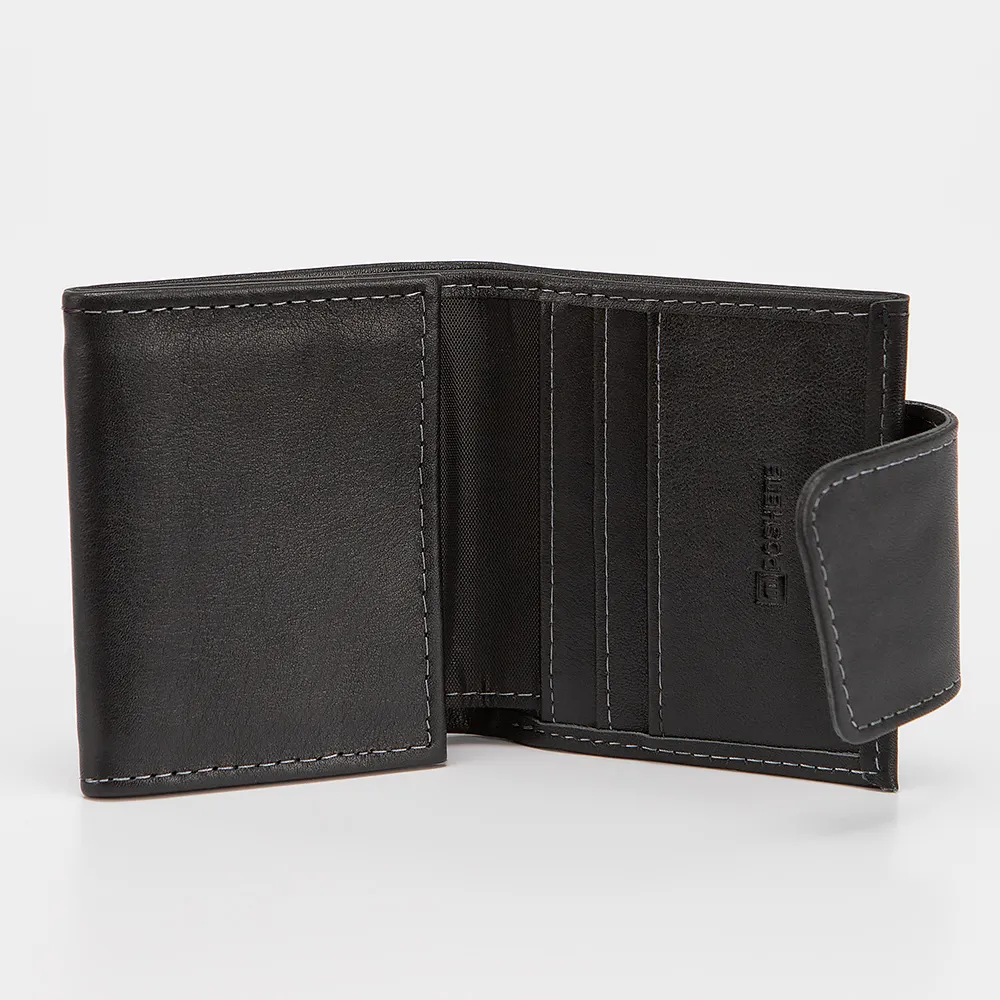 Компактный женский кошелек от Poshete из натуральной кожи черного цвета. Модель в два сложения, закрывается хлястиком на кнопке. Внутри: текстильная подкладка, отделение для купюр, карман для монет на кнопке и прорезные кармашки для пластиковых карт.
