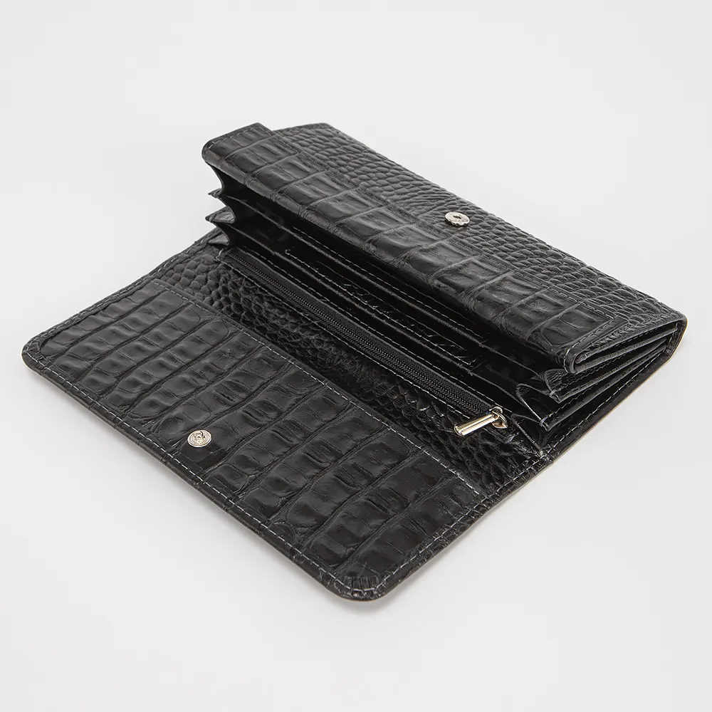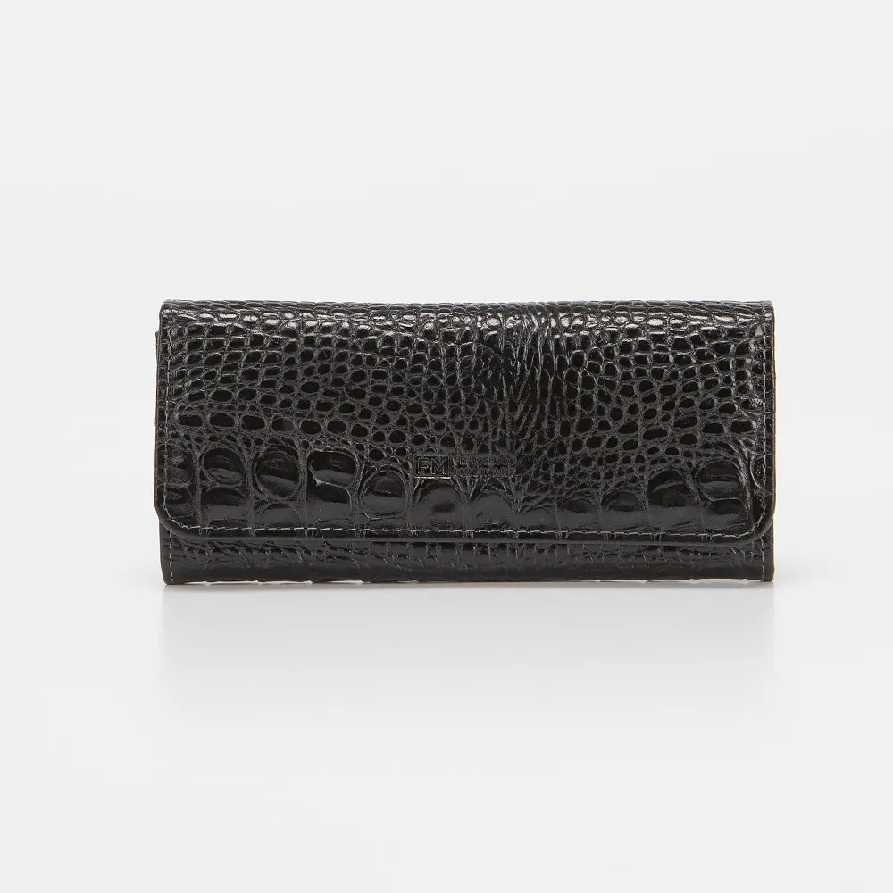 Стильный женский кошелек от бренда Francesco Molinary выполнен из натуральной кожи черного цвета с тиснением под рептилию. Внутри несколько отделений для купюр, карман для монет на кнопке, прорези для пластиковых карт и дополнительный прорезной карман на молнии. Аксессуар с застежкой на металлическую кнопку.