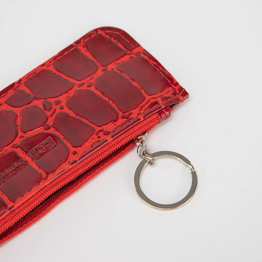 Стильная ключница Francesco Molinary из натуральной кожи красного цвета с тиснением под кожу рептилии. Внутри одно основное отделение с цепочкой под ключи. Модель с застежкой на молнию.