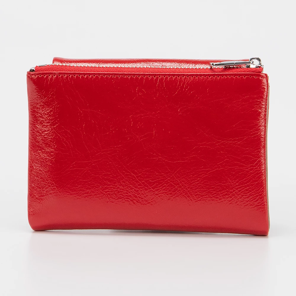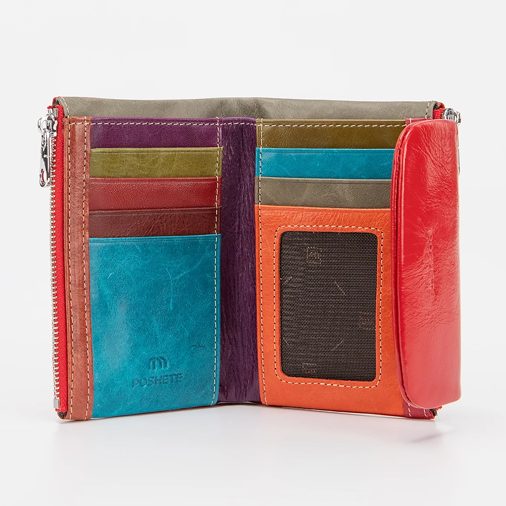 Кошелек от бренда Poshete из натуральной кожи красного цвета. Модель закрывается на кнопку, имеет одно сложение. Внутри: карман на молнии, карман для купюр, карман-окошко, карманы для карт из кожи разных цветов. Снаружи — карман на молнии.