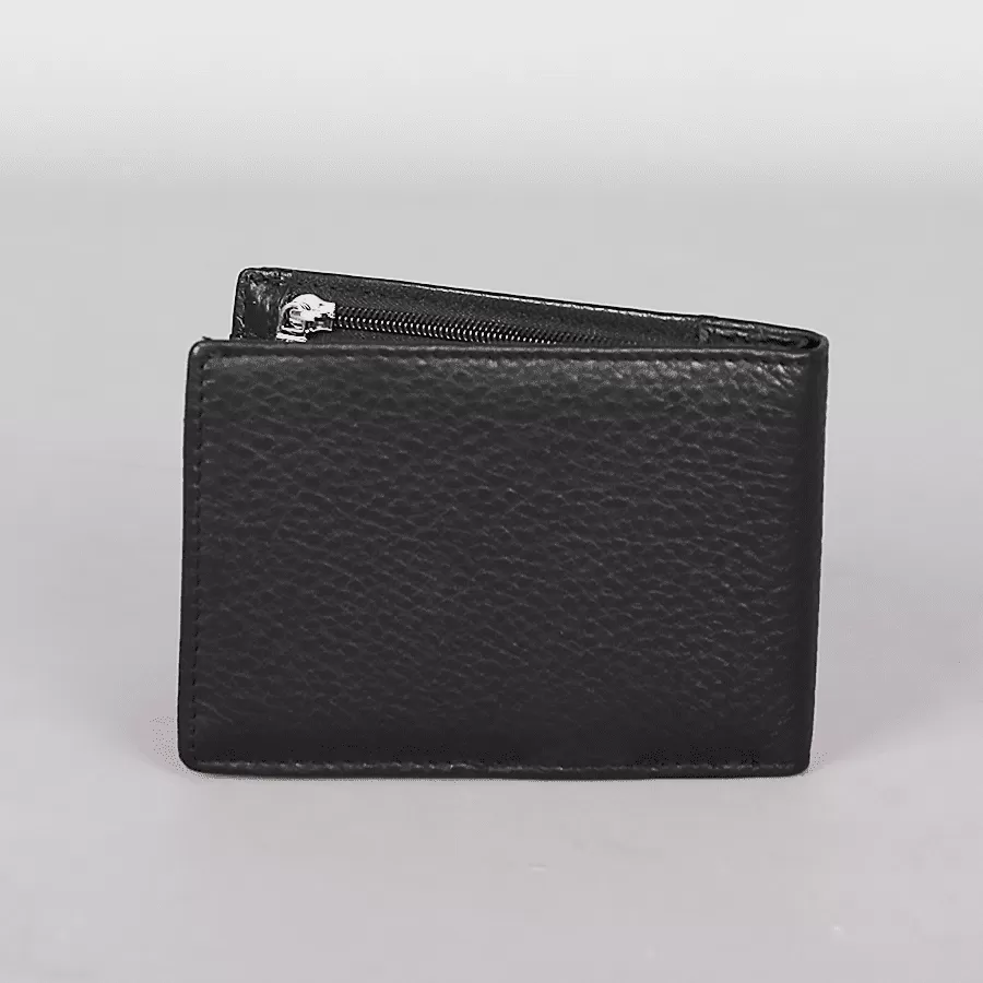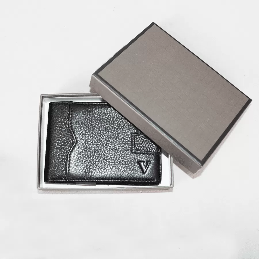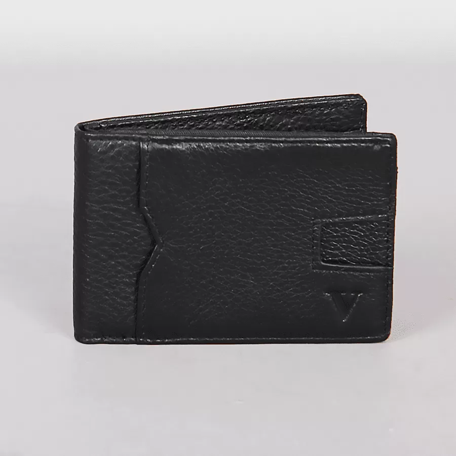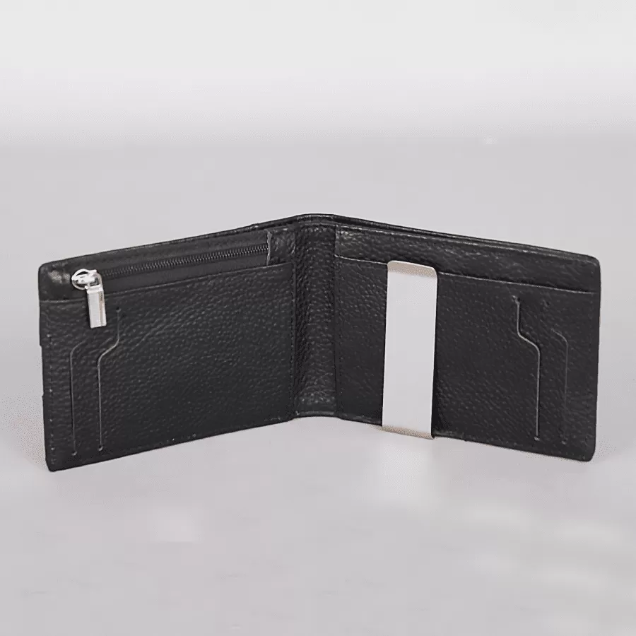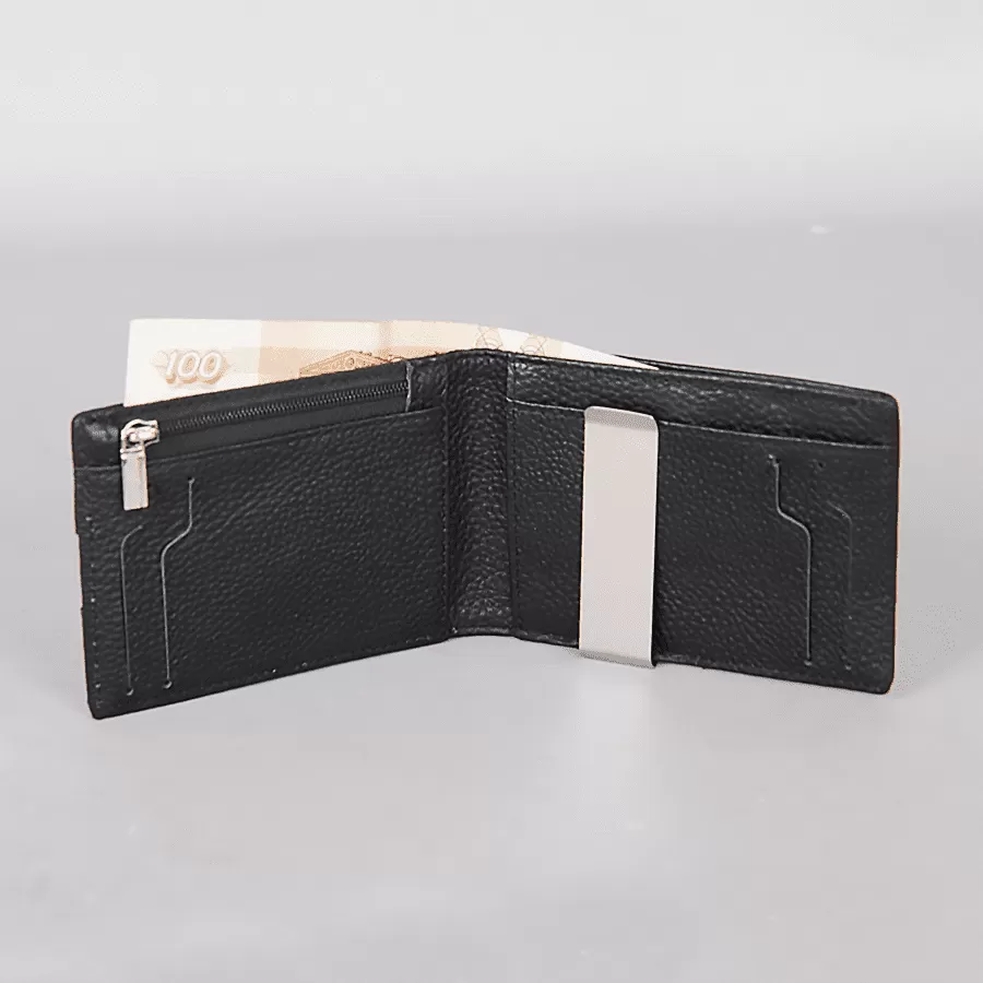 Удобный зажим для денег бренда Valigetti изготовлен из искусственной кожи в черном цвете. На лицевой стороне находится открытый карман для пластиковых карт, а сам зажим складывается в виде книжки. Внутри расположено семь карманов для пластиковых карт, один карман на молнии и специальный карман для купюр. Дополнительным преимуществом является наличие металлического зажима для денег.
