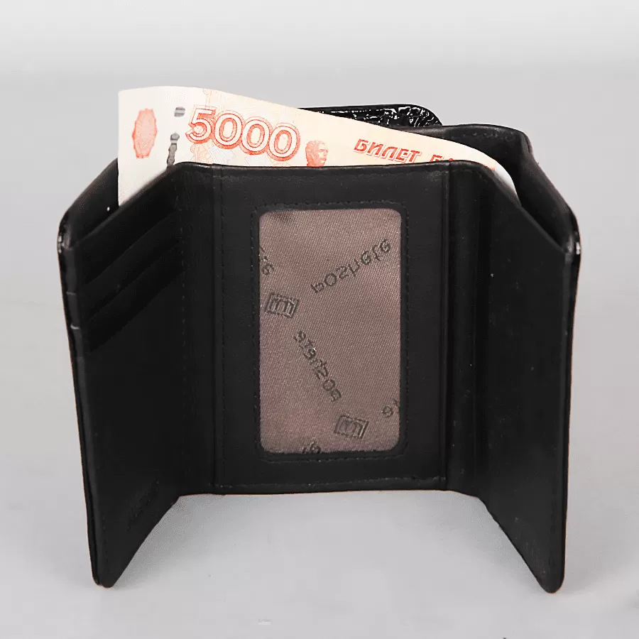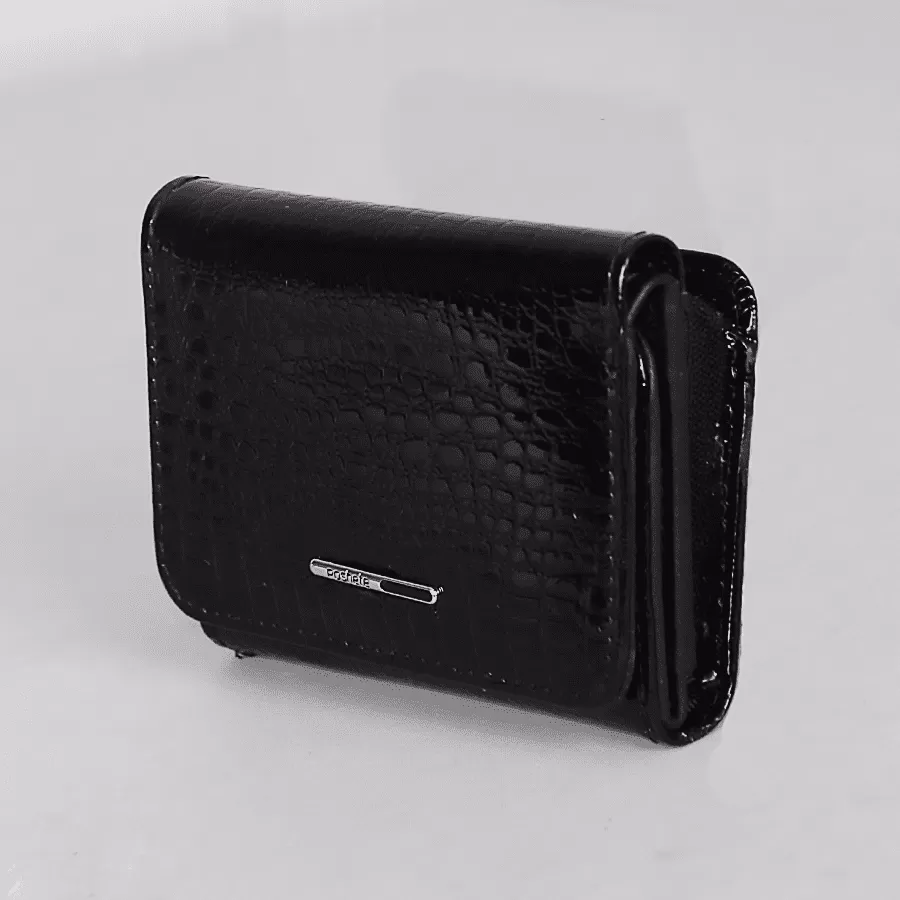 Кошелек бренда Poshete из натуральной лакированной кожи черного цвета с тиснением под рептилию. Он имеет два сложения и закрывается клапаном на магните. Внутри есть отделение для купюр, карманы для карт и карман-окошко. Снаружи находится отделение для монет на молнии с перегородкой внутри.
