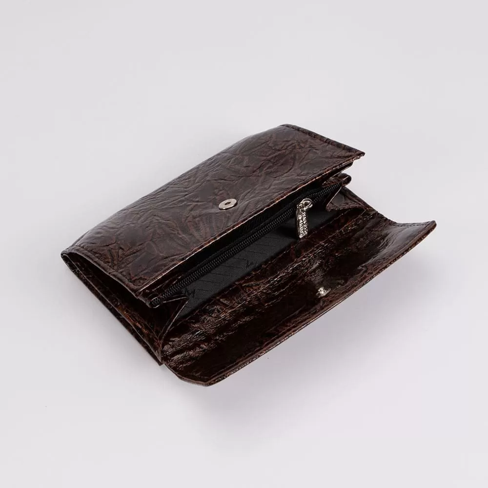 Кошелек бренда Francesco Molinary, изготовленный из натуральной кожи коричневого цвета, имеет оригинальное тиснение. Он закрывается узким клапаном на кнопке и имеет одно сложение, раскрываясь как книжка. Внутри есть отделение для купюр, карманы для карт и карман-окошко. Снаружи имеется отделение для монет с клапаном на кнопке. Внутри также есть средник на молнии.
