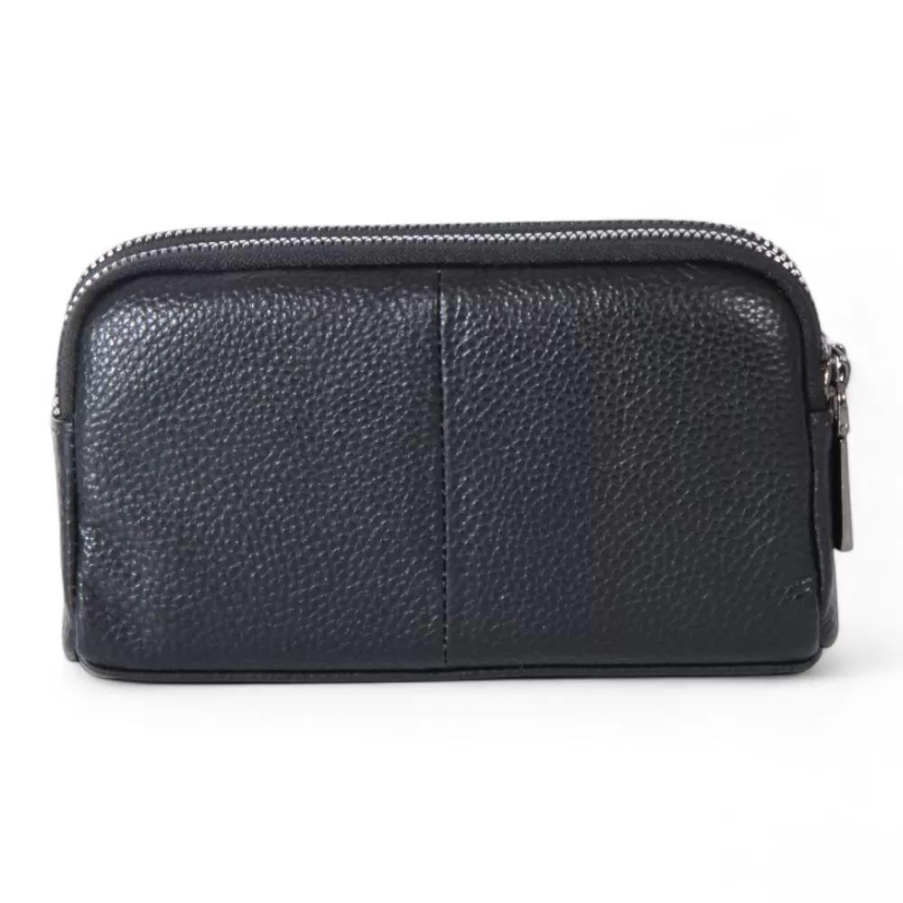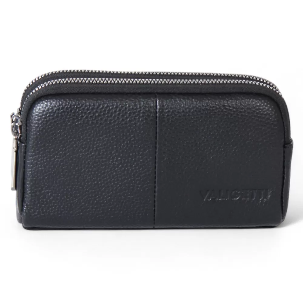Кошелек от бренда Valigetti выполнен из натуральной кожи в черном цвете. Модель кошелька с двумя отделениями: одно для монет, другое для карт, наличных и других мелочей. Внутри первого отделения — накладной карман, во втором — карман на молнии. В комплекте идет ремешок для запястья.