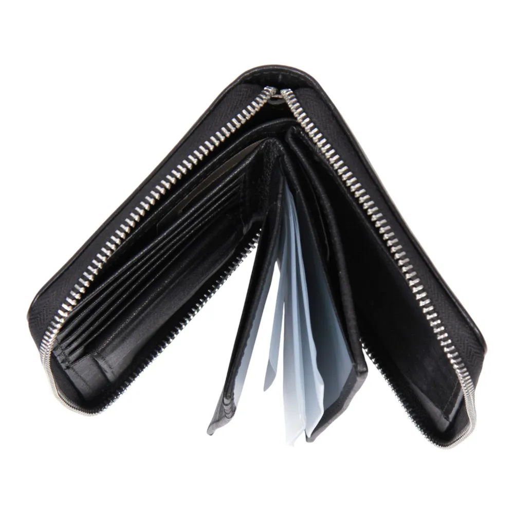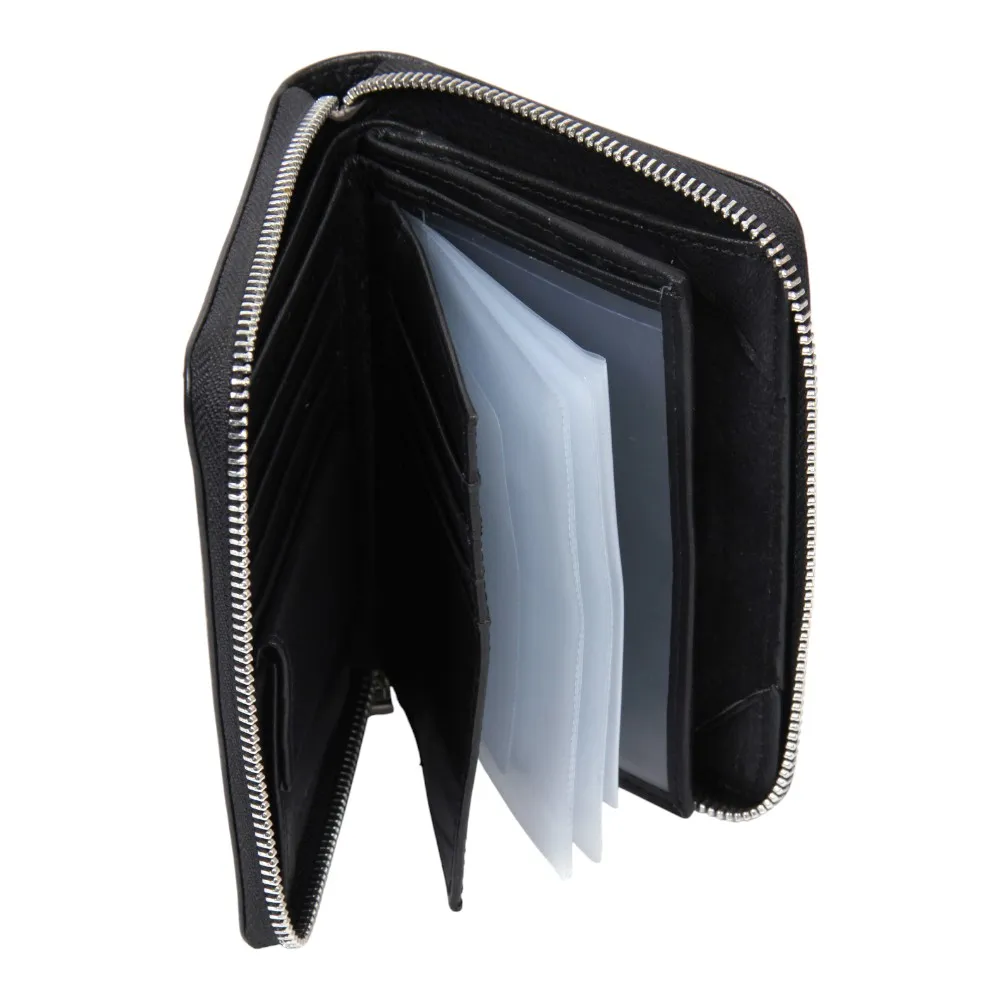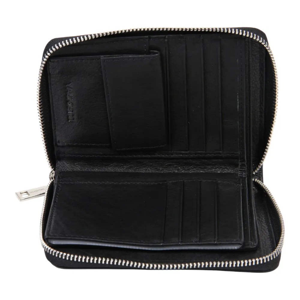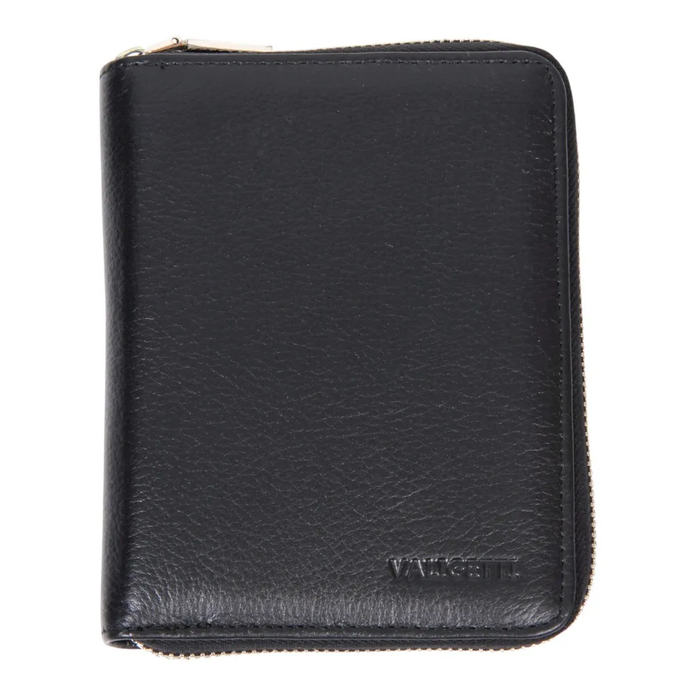 Мужской кожаный бумажник от бренда Valigetti. Внутри два отделения под купюры, кармашек для мелочи на кнопке, 8 специальных отделений для карточек, отделение для паспорта, 2 прозрачного кармашка и 6 отделений для документов-карточек. Так же изделие прошито фирменной подкладкой Valigetti.