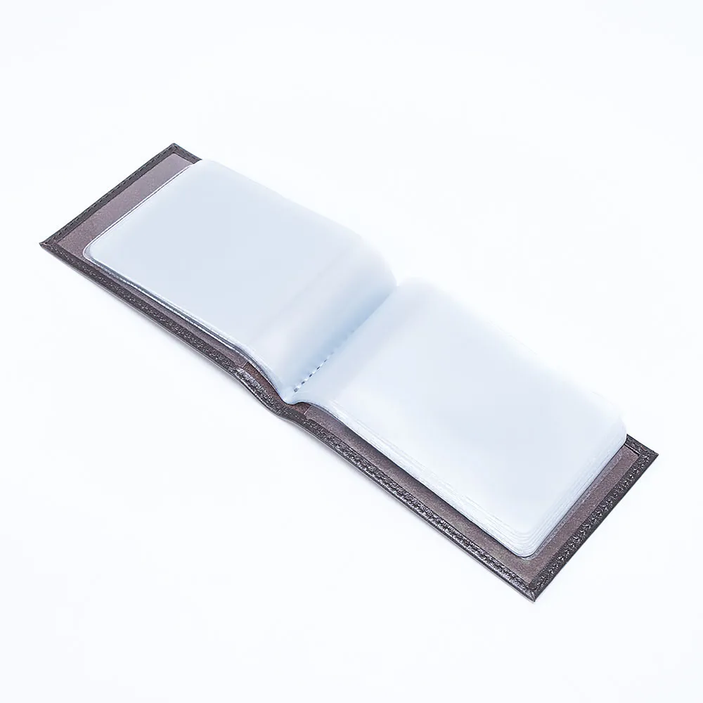 Классическая карманная визитница от бренда Poshete из новой коллекции Грейд. Выполнена из натуральной кожи в коричневом цвете. Внутри двадцать прозрачных кармашков для карточек и два дополнительных прорезных кармашка, слева и справа на обороте обложки с овальными отверстиями под большой палец, для удобного вынимания. Аксессуар без застёжки, раскрывается книжкой. Хорошо сочетается с другими аксессуарами из той же коллекции.