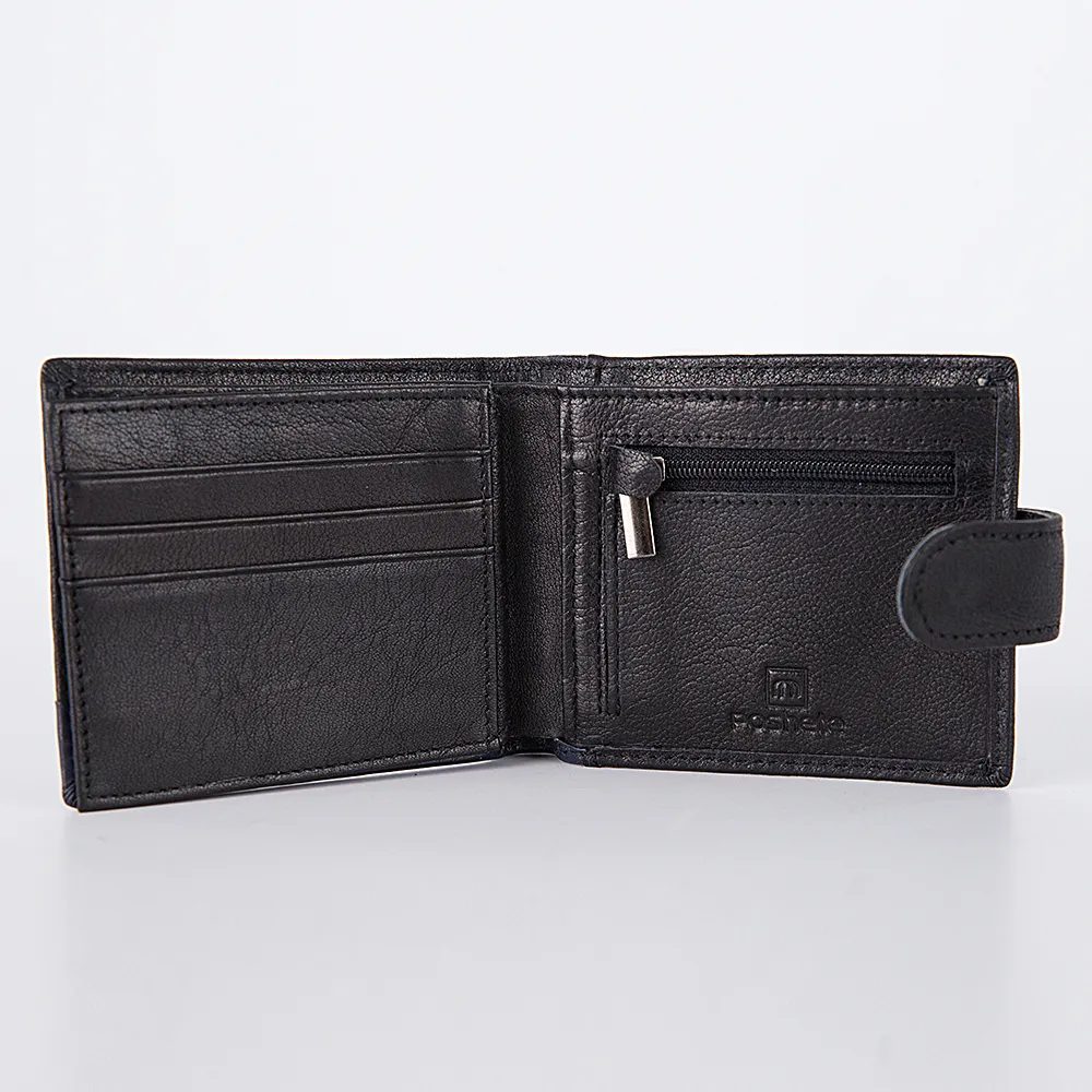 Практичный мужской кошелек из натуральной кожи от бренда Poshete. Модель черного цвета украшена с лицевой стороны кожаной нашивкой более светлого оттенка. Кошелек закрывается на кнопку, внутри отделение для купюр, карманы для пластиковых карт и прорезной карман для мелких монет. Удобно хранить как в сумке, так и в кармане одежды.