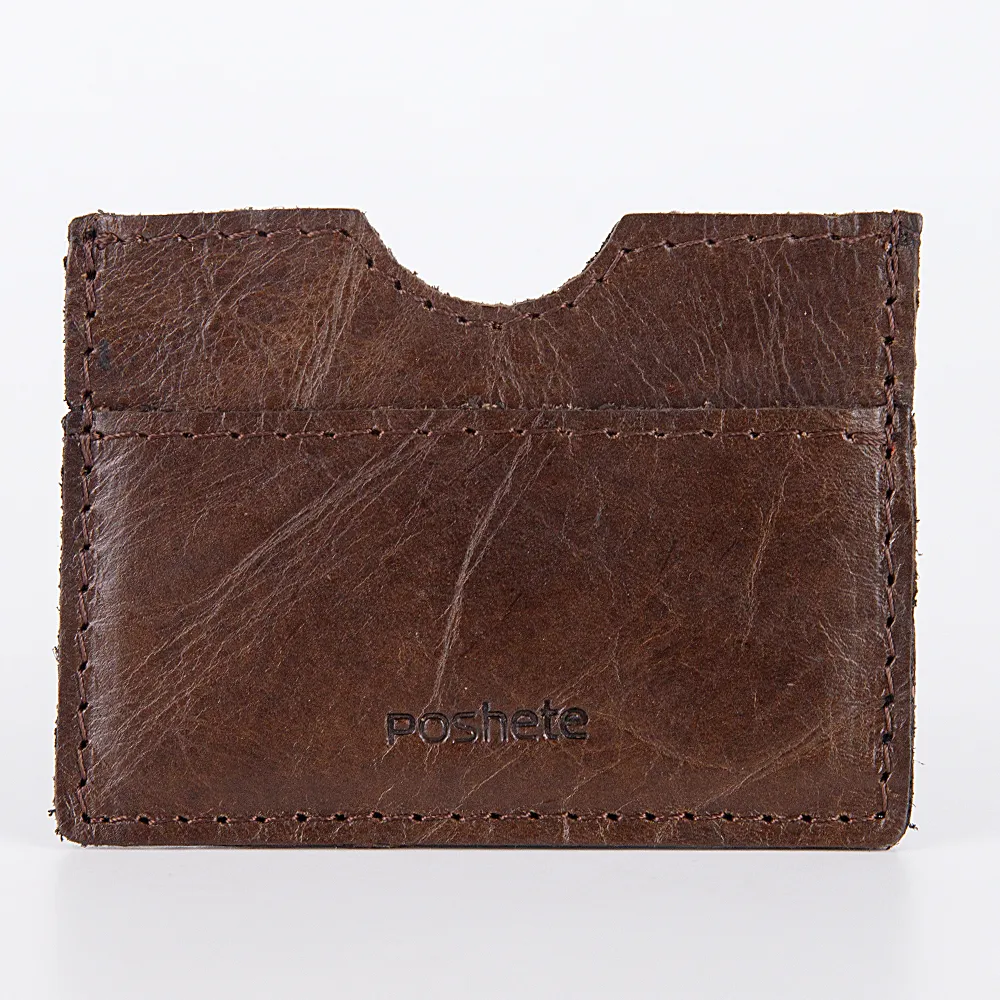 Компактная визитница Poshete выполнена из натуральной кожи в тёмно-коричневом цвете, с оборотной стороны замшевая. Имеет три кармана для пластиковых карт, без застёжек.