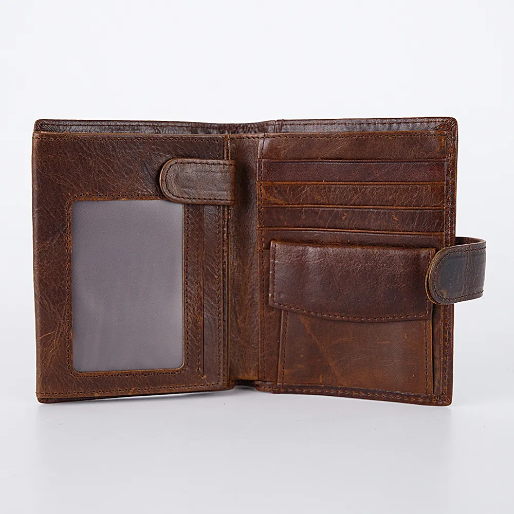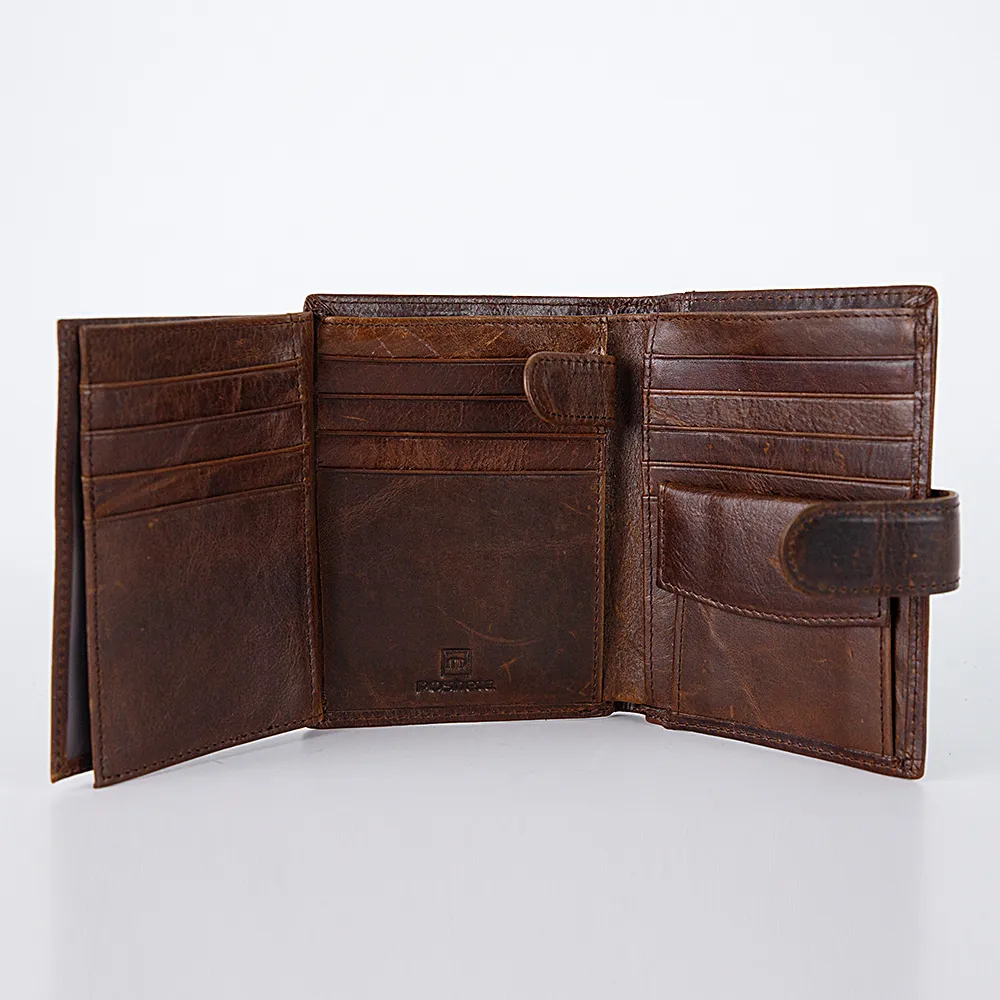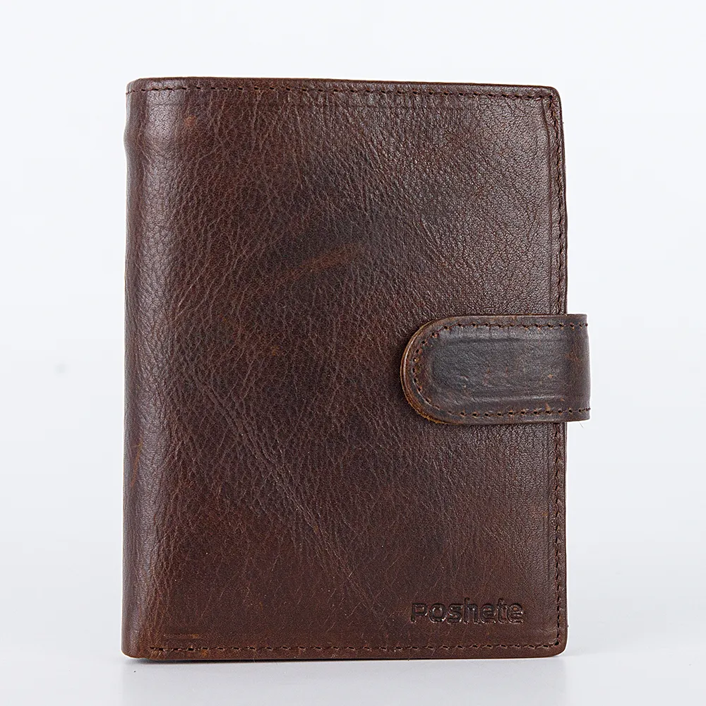 Бумажник от торговой марки Poshete из натуральной кожи коричневого цвета. Закрывается хлястиком на кнопке. Имеет два сложения. Внутри: отделение для купюр и документов, карманы для карт, перегородка, фиксирующаяся хлястиком на кнопку, карман-окошко, карман для монет с клапаном на кнопке.