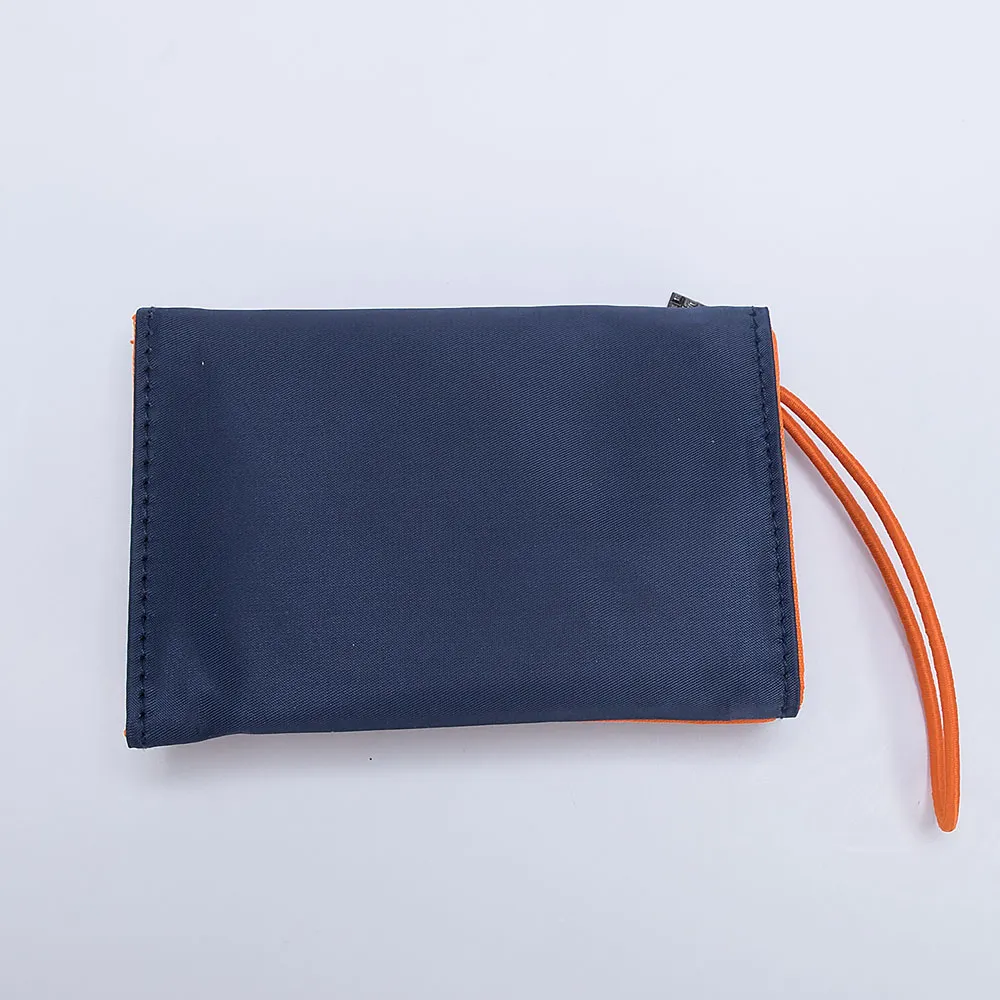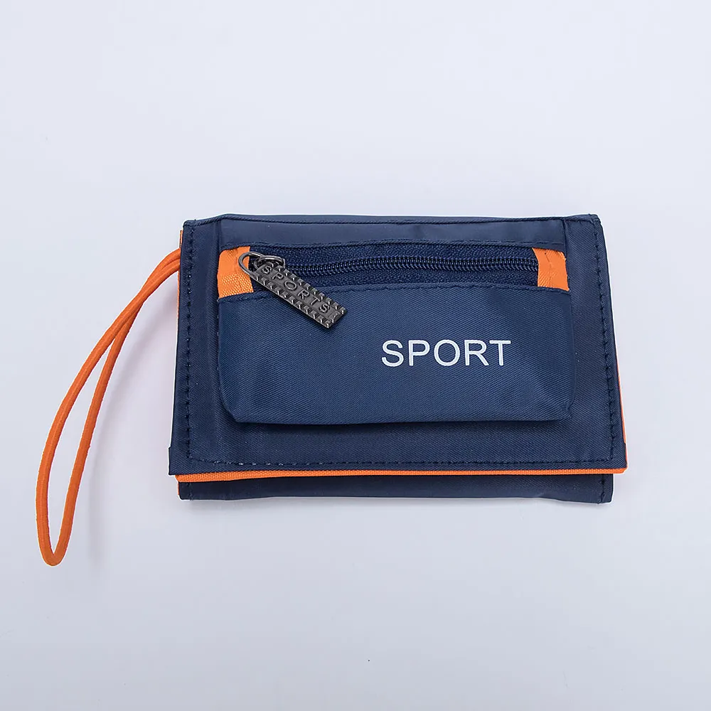 Спортивный кошелек Ecotope выполнен из плотного текстильного материала тёмно-синего цвета с оранжевыми полосками. Внутри отделение для купюр, карман для монет на молнии и несколько кармашков для пластиковых карт. Закрывается липучками и оснащен шнурком для фиксации на другом аксессуаре или одежде.