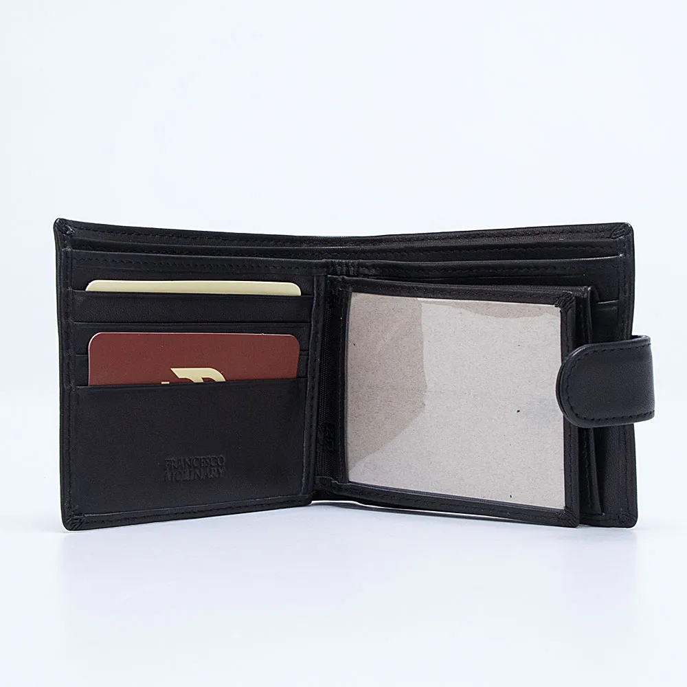 Классический мужской кошелек от бренда Francesco Molinary выполнен из натуральной мягкой кожи черного цвета с тисненым логотипом бренда. Внутри два отделения для купюр, несколько прорезей для пластиковых карт, а также карман для монет на кнопке. Аксессуар с застежкой на ремешок на кнопке.