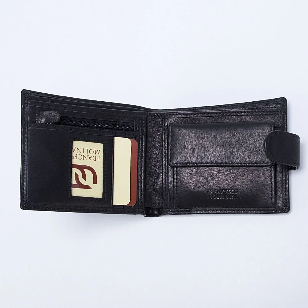 Стильный мужской кошелек Francesco Molinary из натуральной мягкой кожи с естественной фактурой и серебристой металлической фурнитурой. Внутри два отделения для купюр, карман для монет на кнопке, прорезной карман на молнии и несколько прорезей для пластиковых карт. Аксессуар с застежкой на кнопку.