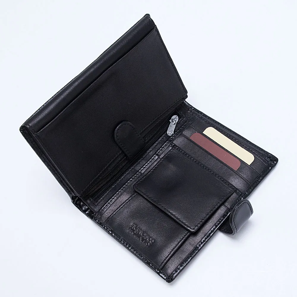 Стильный мужской кошелек Francesco Molinary из натуральной мягкой кожи с естественной фактурой и серебристой металлической фурнитурой. Внутри два отделения для купюр, карман для монет на кнопке, несколько прорезей для пластиковых карт и отделения для паспорта и автодокументов. Аксессуар с застежкой на кнопку.