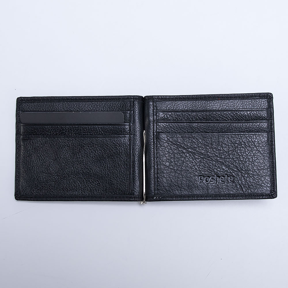 Классический зажим для денег Poshete из натуральной фактурной кожи, выполнен в чёрном цвете и украшен золотистым металлическим шильдиком с логотипом бренда. Зажим находится по центру, а слева и справа по три кармашка для карточек или визиток.