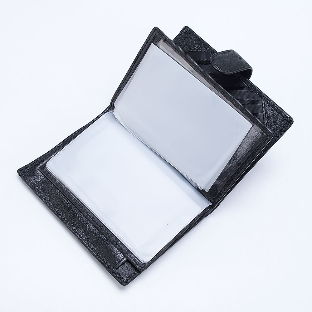 Универсальный бумажник Poshete чёрного цвета из натуральной матовой кожи. Внутри два отделения для купюр, кармашки для сим карт, накладной кармашек для монет на кнопке, кармашки для карточек, отделение для паспорта и пластиковые кармашки для авто документов. Бумажник книжной формы, закрывается на ремешок с кнопкой.