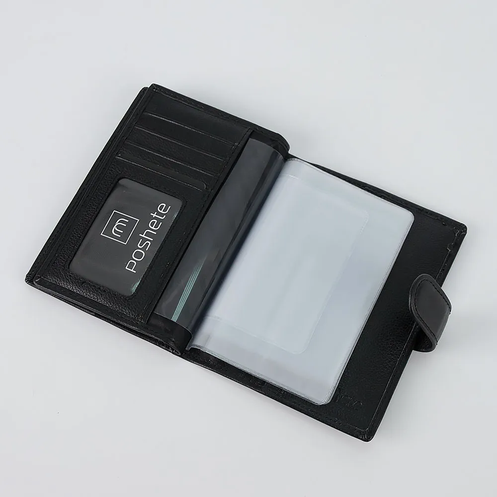 Универсальная обложка для паспорта и автодокументов от торговой марки Poshete изготовлена из натуральной кожи черного цвета. Закрывается хлястиком на кнопку. Внутри: фирменная подкладка, отделение-разворот для паспорта, карман-окошко, карманы для карт, блок с прозрачными файлами разного формата для автодокументов, отделения для документов.