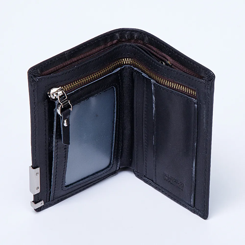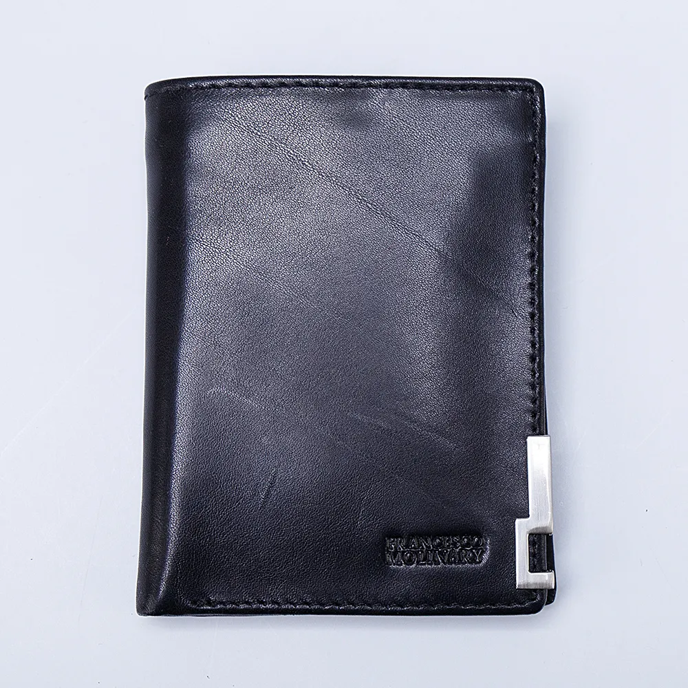 Мужской кошелёк от бренда Francesco Molinary чёрного цвета, с отличным качеством отделки, выполнен из натуральной кожи с внутренней подкладкой из текстильного материала. Прямоугольной формы, складывается пополам, раскрывается книжкой, без застёжки. Внутри отделение для купюр, карман на молнии, кармашки для карточек.