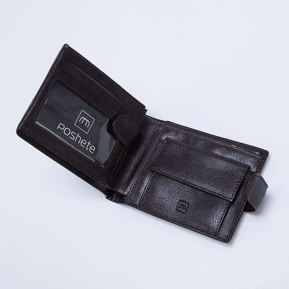 Мужской кошелёк Poshete коричневого цвета, выполнен из искусственной матовой кожи. Спереди украшен металлической молнией. Внутри два отделения для купюр, накладной кармашек для монет на кнопке, кармашки для карточек и кармашек с прозрачным окошком. Удобный в использовании, закрывается на кнопку.