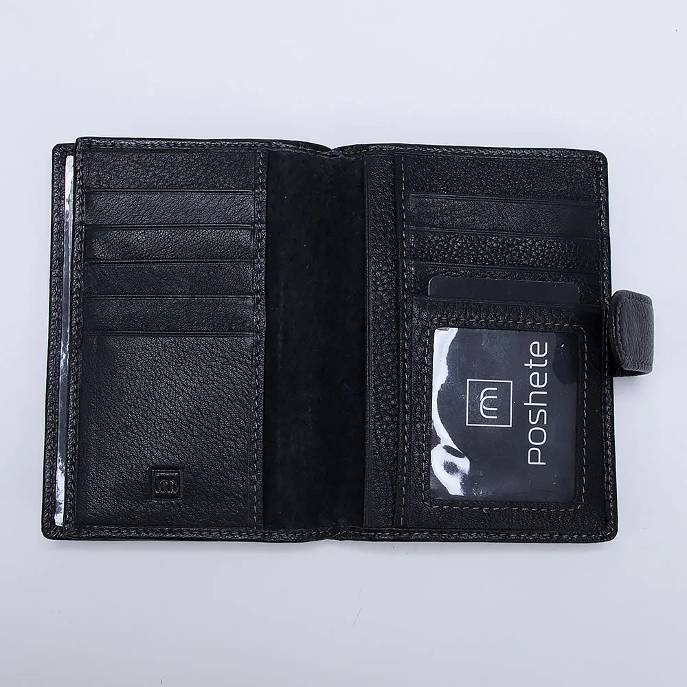 Обложка для паспорта и автодокументов от бренда Poshete выполнена из натуральной кожи черного цвета. Модель закрывается хлястиком на кнопку. Внутри имеются прозрачные клапаны для паспорта, перегородка с отделениями для карт, вкладыши-файлы для документов, карман-окошко. Многофункциональный стильный аксессуар станет незаменимым и бережно сохранит документы.