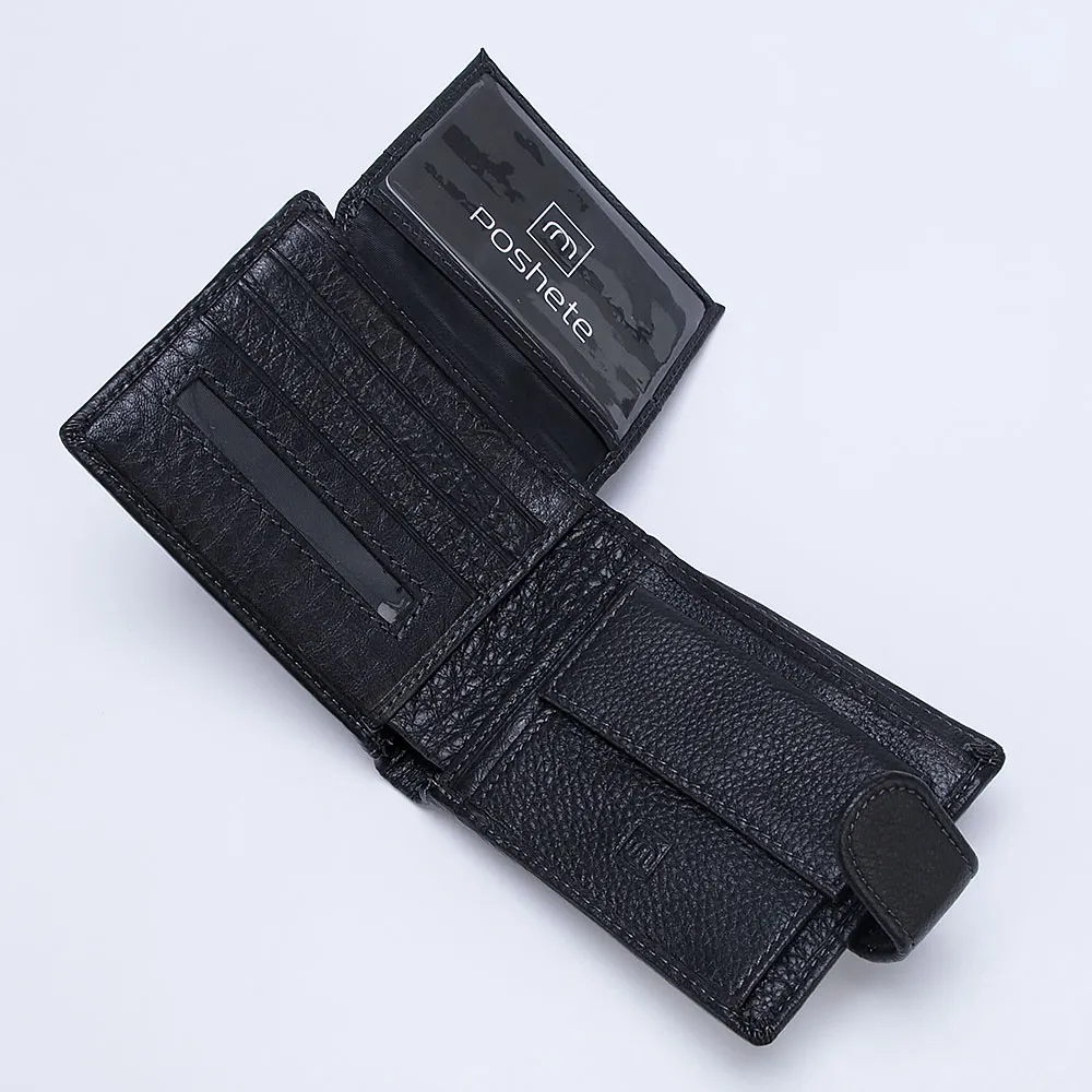 Стильный кошелек от бренда Poshete выполнен из натуральной кожи черного цвета. Модель закрывается хлястиком на кнопку. Внутри: отделение для купюр, в том числе на молнии, перегородка с карманами для карт; карман для монет закрывается клапаном. Кошелек декорирован фигурной вставкой спереди и сзади, с отстрочкой, а также тиснением с названием бренда на лицевой стороне и эмблемой бренда на монетнице.