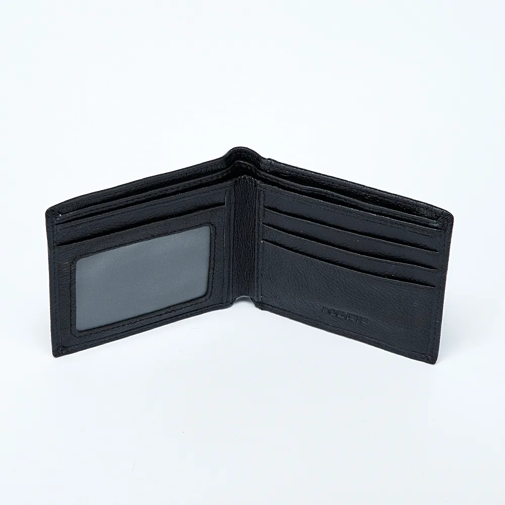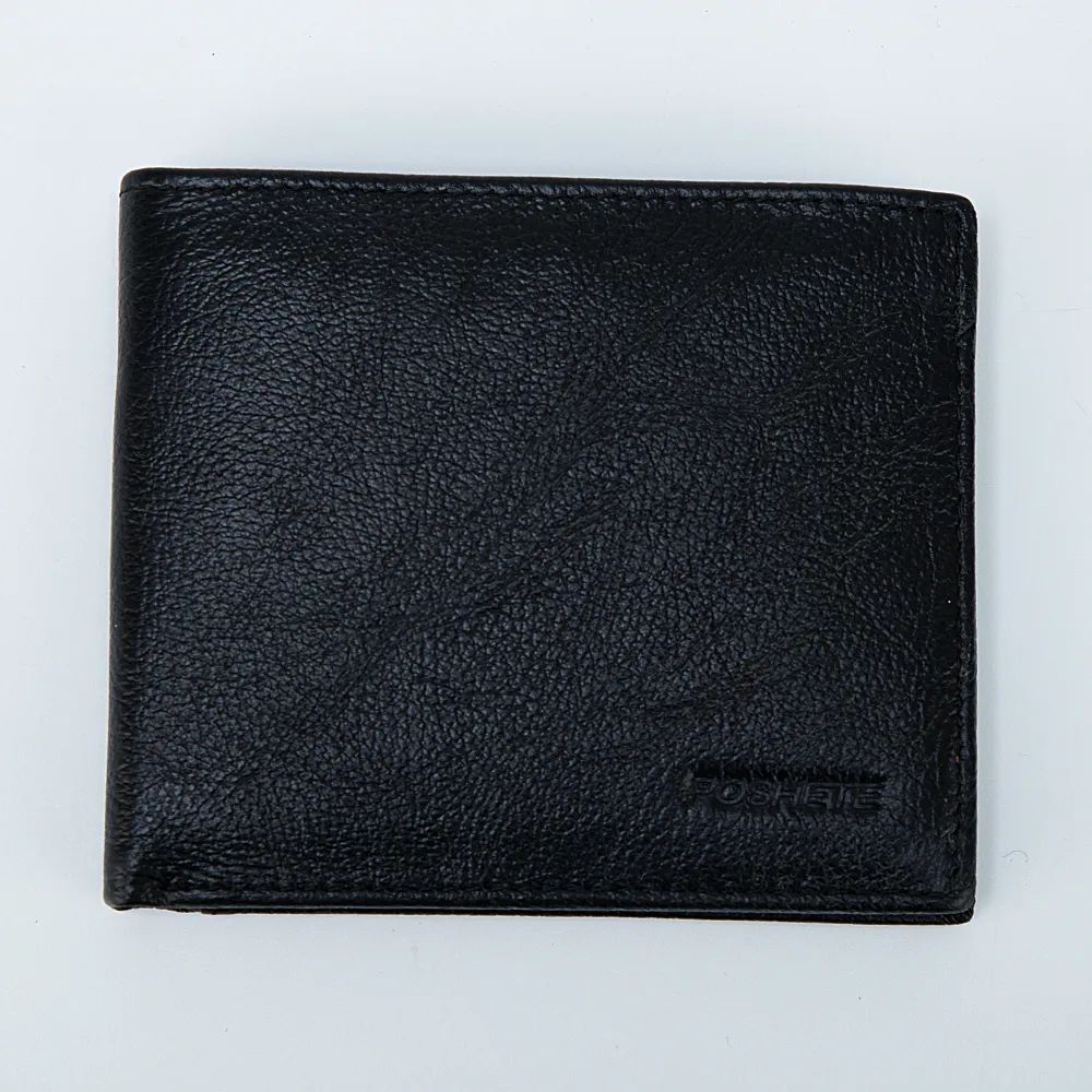 Компактный мужской кошелёк Poshete выполнен из натуральной кожи. Модель с простым дизайном, квадратной формы, чёрного цвета. Раскрывается книжкой, не имеет застёжки, внутри отделение для купюр, кармашки для пластиковых карт и кармашек-окошко.