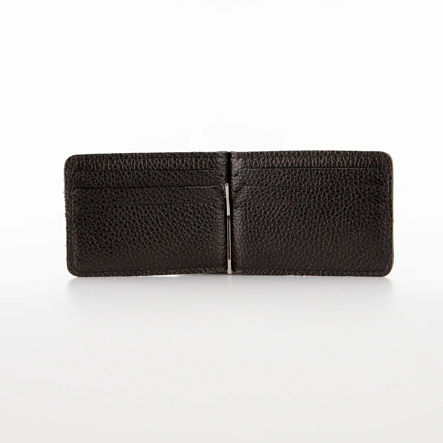 Зажим для денег от торговой марки Francesco Molinary из натуральной кожи черного цвета. Модель раскрывается книжкой. Внутри: металлическая скрепка-зажим для купюр, карманы для карт. Снаружи на задней стороне: карман для монет с клапаном на кнопке.