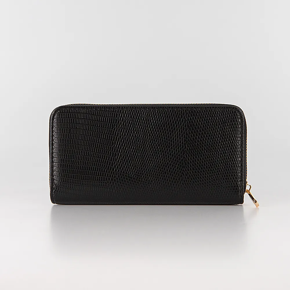 Полноразмерный кошелек от торговой марки David Jones из искусственной кожи черного цвета. Декорирована тиснением под рептилию. Модель с отделением на молнии. Внутри: карманы для карт, купюр, карман для монет на молнии.