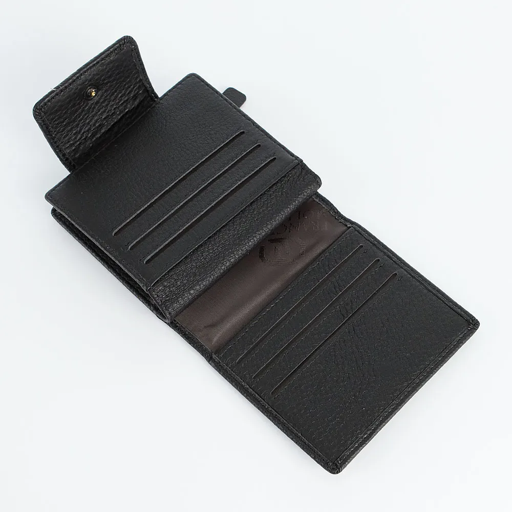 Кошелек от торговой марки Francesco Molinary из натуральной кожи черного цвета. Модель закрывается клапаном на кнопке; имеет одно сложение, раскрывается книжкой. Внутри: отделение для купюр, карманы для карт, откидная перегородка с карманом-окошком. Снаружи на задней стороне – карман на молнии.