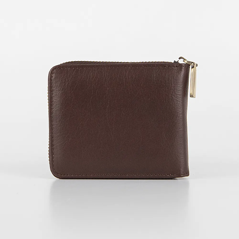 Кошелек от торговой марки Poshete из натуральной кожи коричневого цвета. Компактная модель закрывается молнией по трем сторонам. Внутри: карманы для карт, карман-окошко на откидной перегородке, карман на молнии, два отделения для купюр.