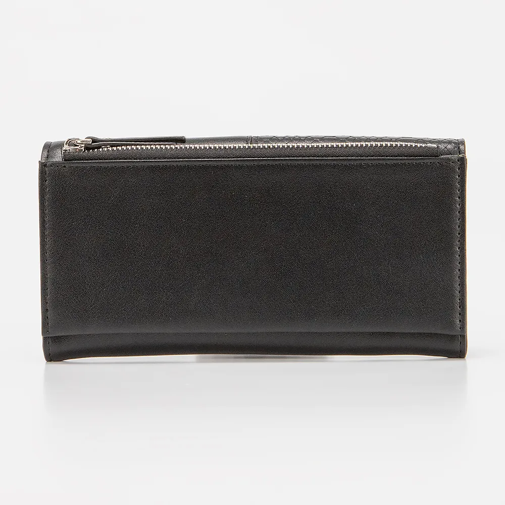 Полноразмерный кошелек от торговой марки Passo Avanti из искусственной кожи черного цвета. Модель с клапаном на скрытых магнитах. Внутри: отделения для купюр, карманы для карт, карман для монет на молнии. Снаружи на задней стороне – карман на молнии. Лицевая сторона декорирована вставкой с тиснением под змеиную кожу.