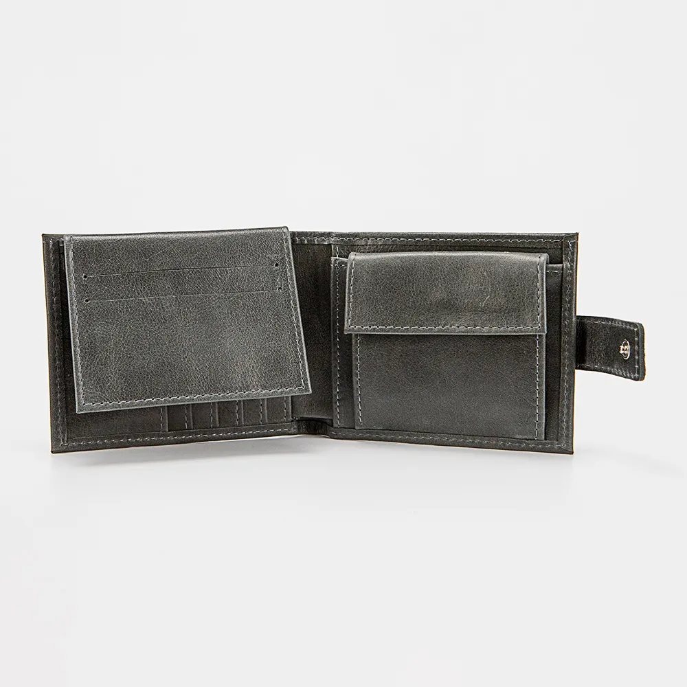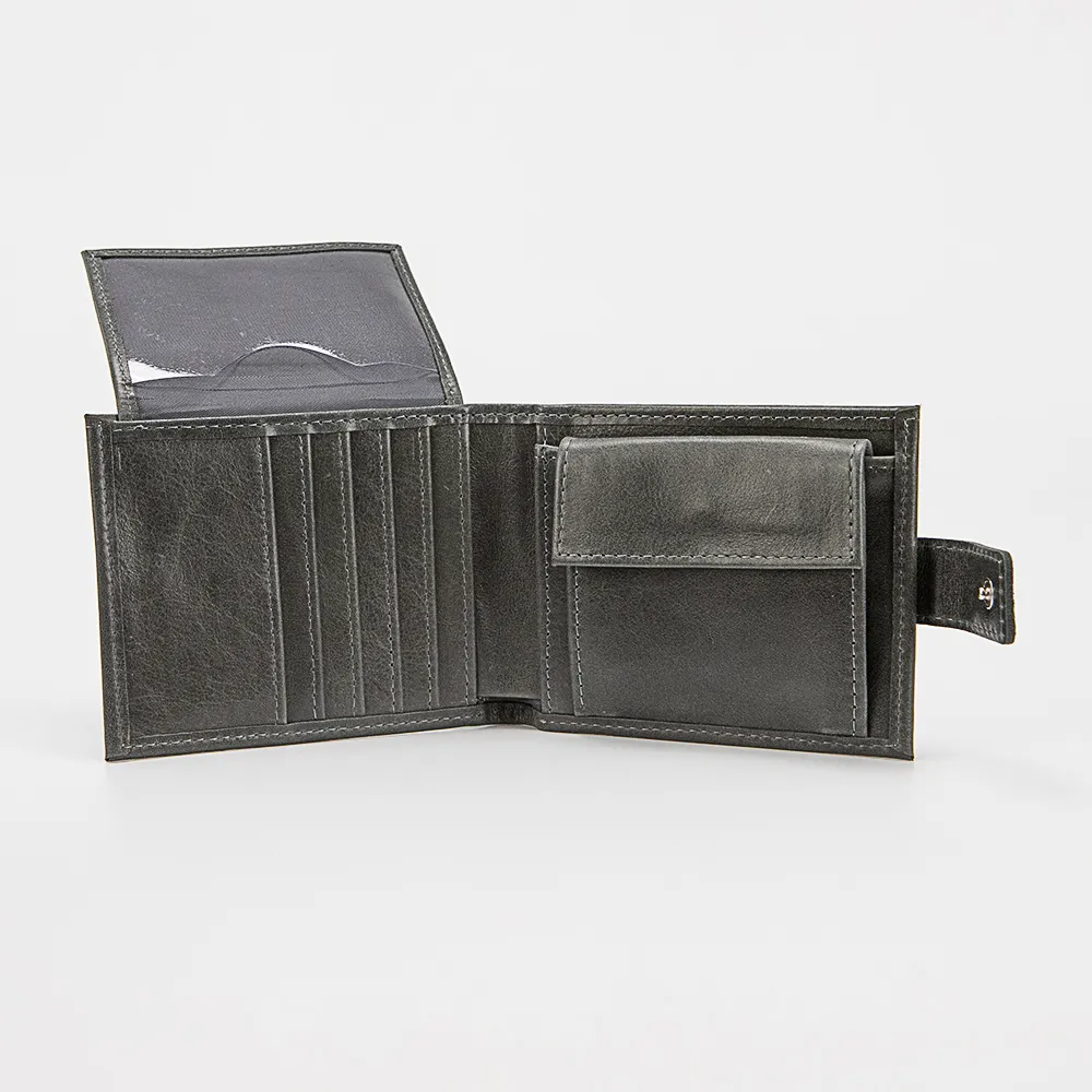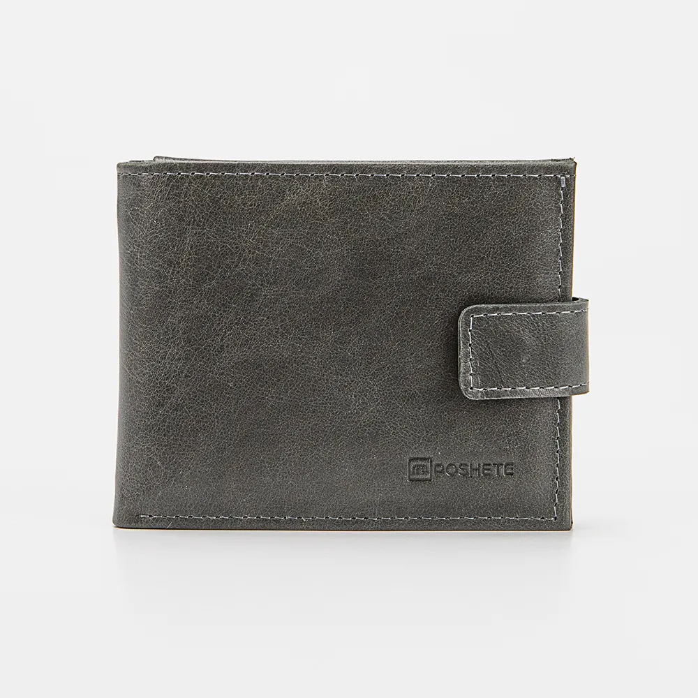 Кошелек от торговой марки Poshete из натуральной кожи серого цвета. Модель закрывается хлястиком на кнопке, раскрывается книжкой. Внутри: отделение для купюр, карманы для карт, откидная панель с карманами для карт и карманом-окошком, карман для монет с клапаном на кнопке.