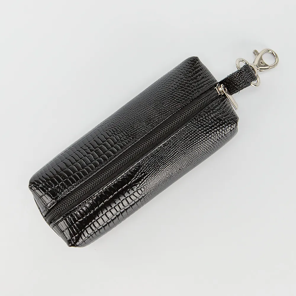 Ключница от торговой марки Poshete из натуральной кожи с тиснением под рептилию. Модель с карабином для крепления. Отделение на молнии, без подкладки. Внутри: кольцо для ключей.