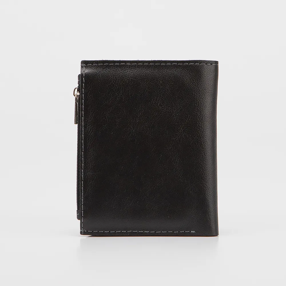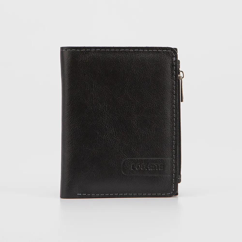 Кошелёк от торговой марки Poshete выполнен из натуральной кожи черного цвета. Модель с одним сложением, фиксируется кнопкой, раскрывается книжкой. Внутри: карманы для купюр и пластиковых карт. Снаружи: боковой карман на молнии.