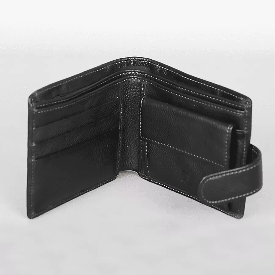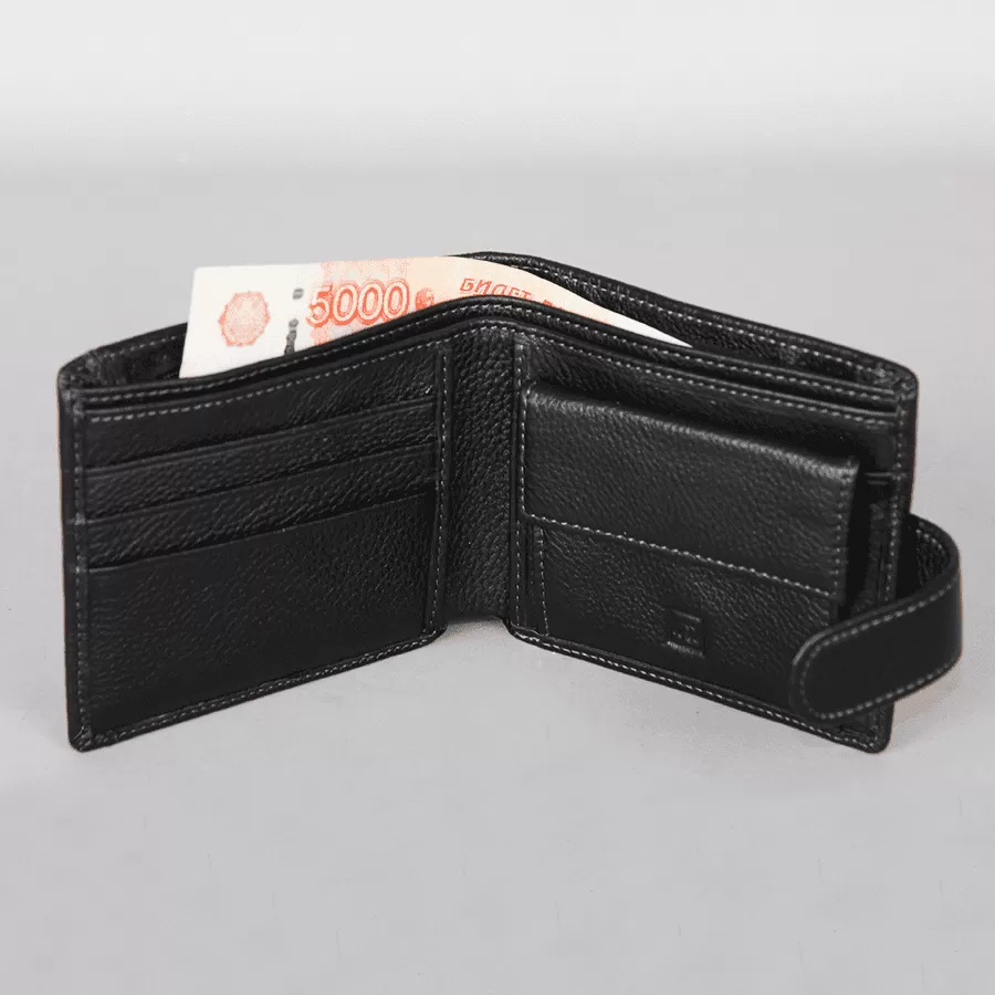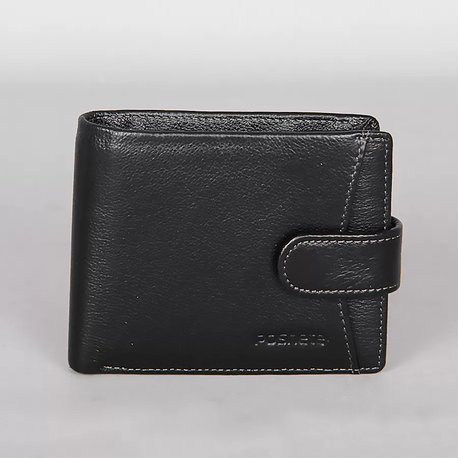 Классический кожаный кошелёк бренда Poshete выполнен в чёрном цвете. Он компактен и удобен в использовании. Модель складывается пополам и закрывается ремешком на кнопку.