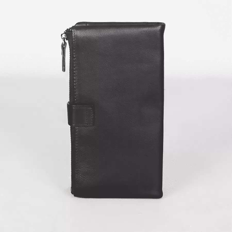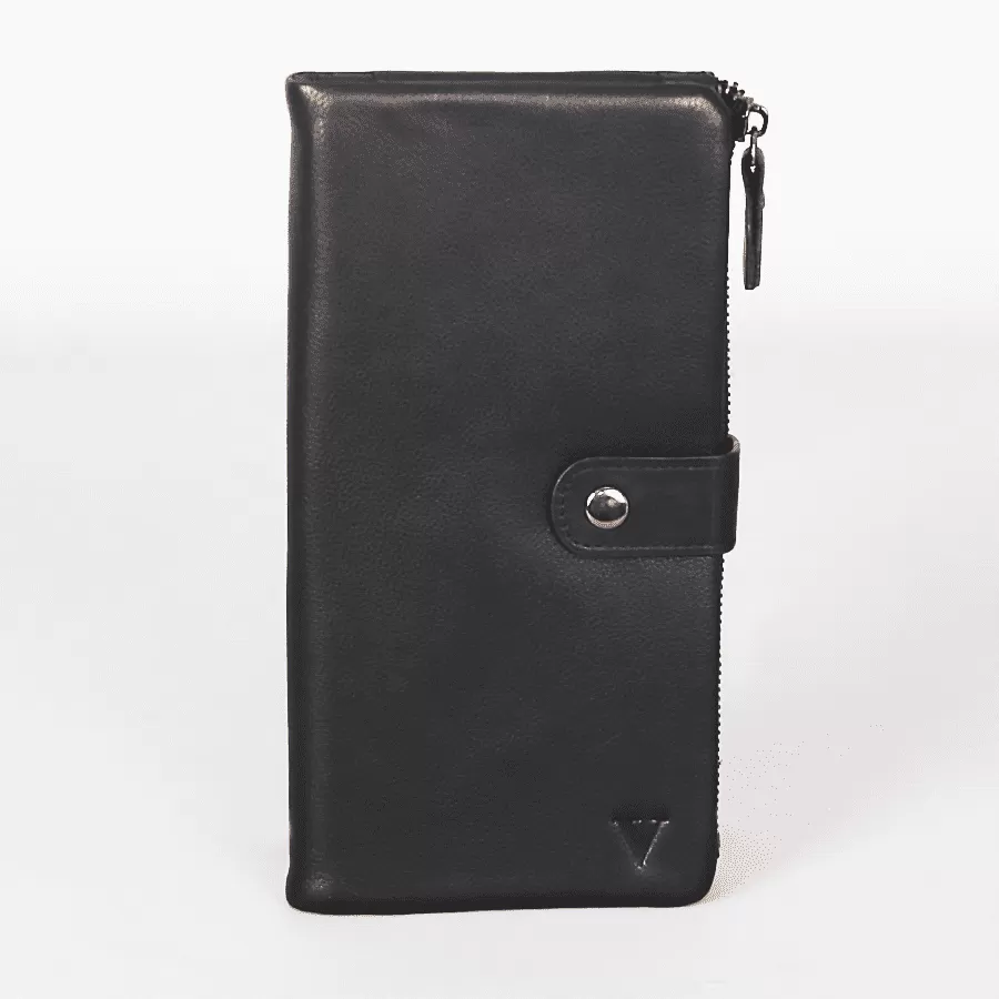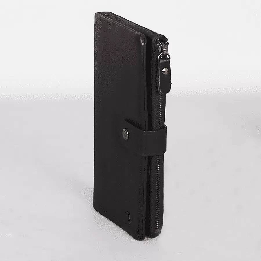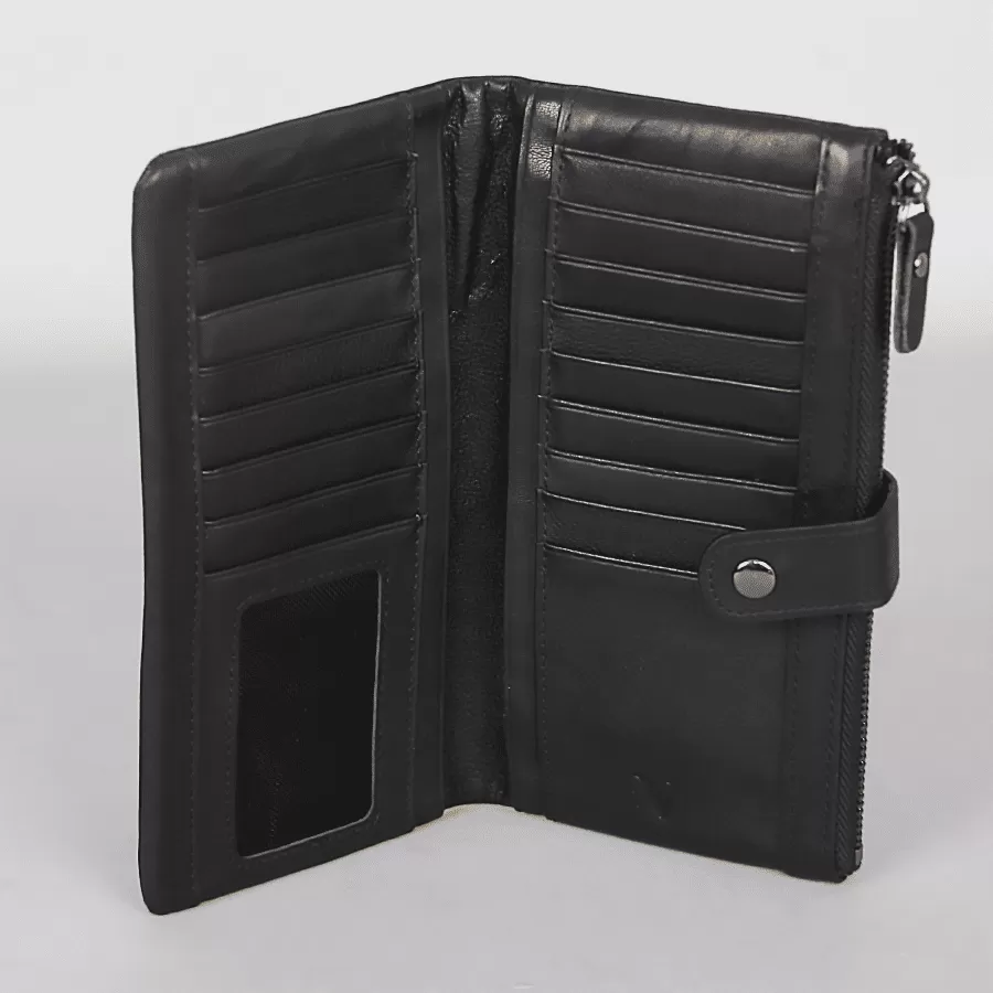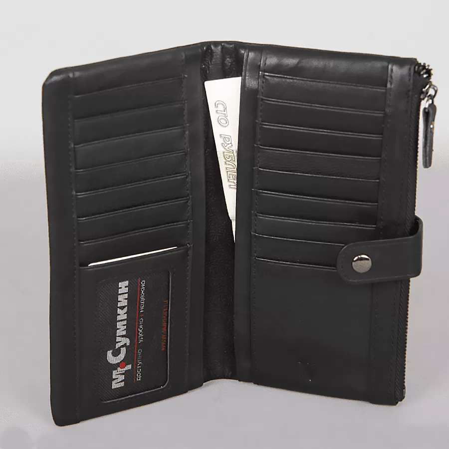 Функциональный кошелек бренда Valigetti изготовлен из натуральной кожи черного цвета. Модель складывается в виде книжки и закрывается на хлястик с кнопкой. На боковой стороне расположен удобный карман на молнии. В кошельке есть 17 отделений для пластиковых карт и 4 отделения для купюр.