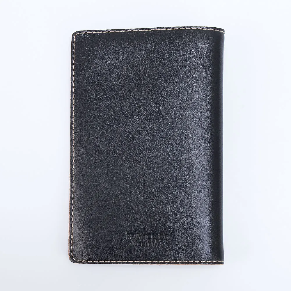 Обложка на паспорт классической модели от бренда Francesco Molinary выполнена из натуральной мягкой кожи классического черного цвета с декоративной контрастной отстрочкой.