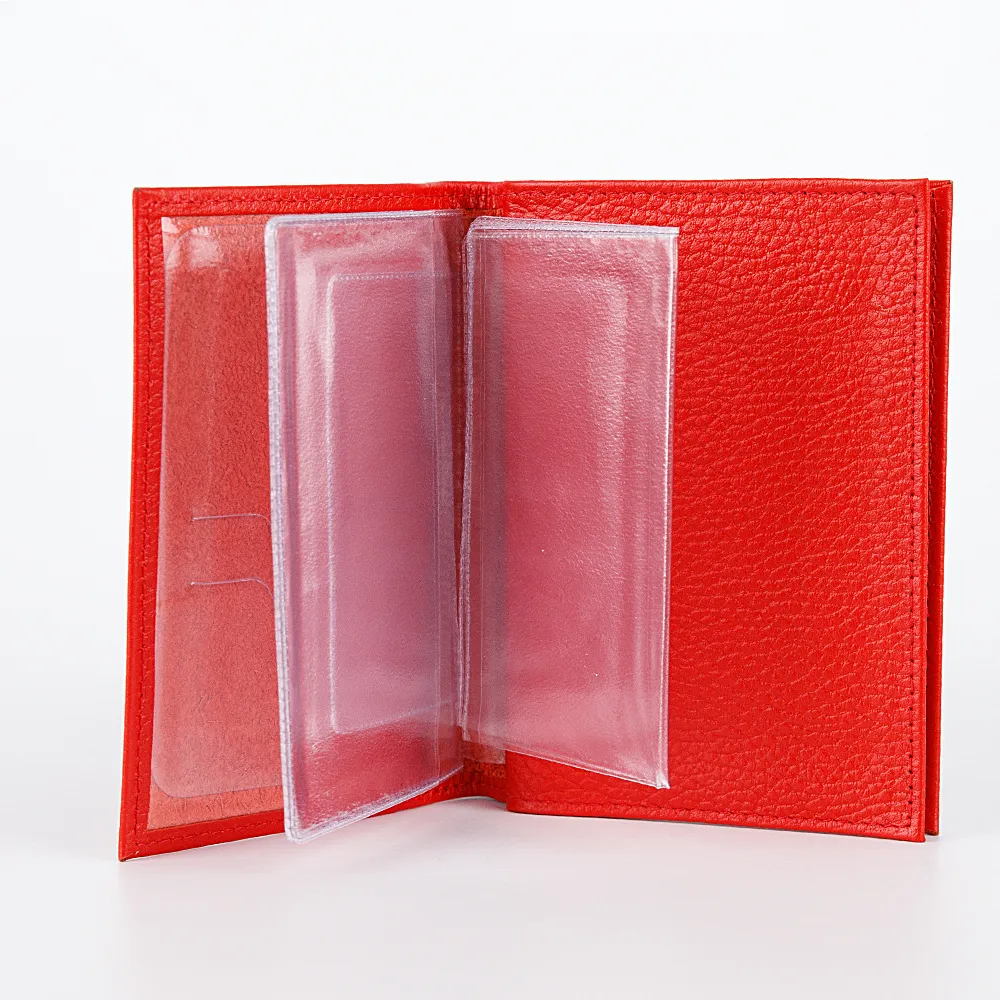 Классическая обложка для паспорта и автодокументов от бренда Poshete. Аксессуар красного цвета из натуральной мягкой кожи. Внутри отделение для паспорта и разноразмерные отделения для автодокументов. Модель без застежки.