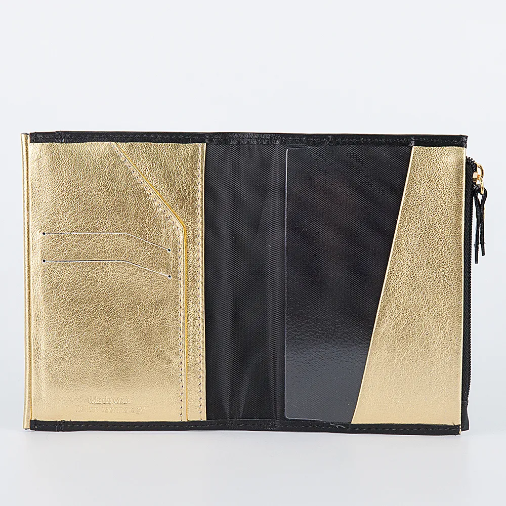 Стильная обложка для паспорта эксклюзивной коллекции от торговой марки Borasco изготовлена из натуральной кожи в сочетании черного и золотого цвета. Модель с карманами для карт, карманом на молнии с пуллером, декорированным стразой.
