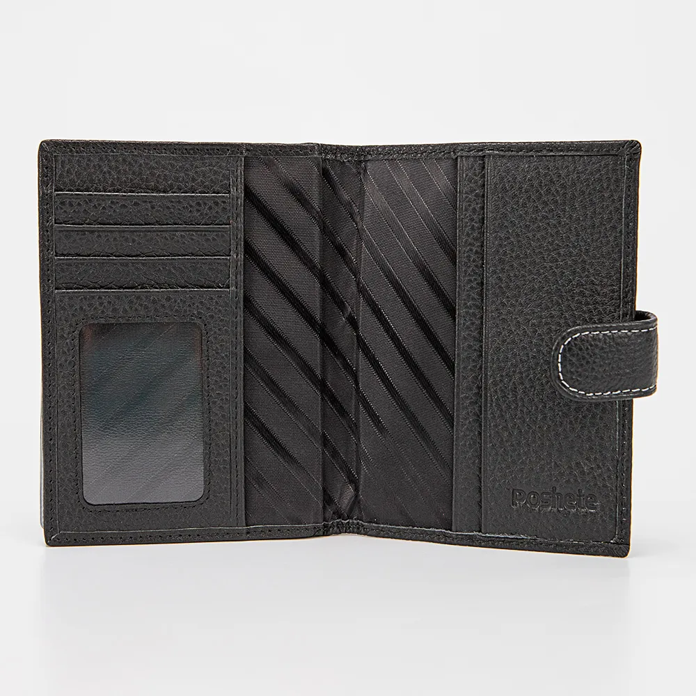 Универсальная обложка для паспорта и автодокументов от торговой марки Poshete изготовлена из натуральной кожи черного цвет с контрастной отстрочкой. Закрывается хлястиком на кнопку. Внутри: отделение-разворот для паспорта, отделения для документов, карманы для карт, блок с прозрачными файлами разного формата для автодокументов, карман-окошко.