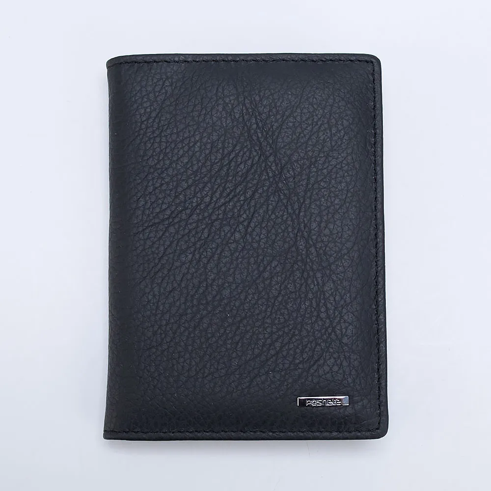 Обложка для паспорта Poshete чёрного цвета из натуральной матовой кожи. Универсальная, подойдёт для мужского портфеля, дамской сумочки или дорожного саквояжа. Внутри текстиль в полоску коричневого цвета. Кармашки для фиксации первой и последней страницы паспорта прозрачные.
