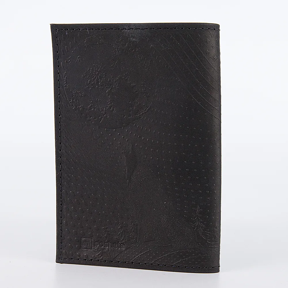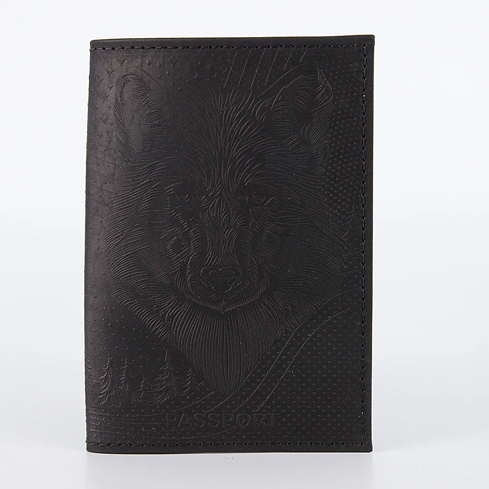 Обложка для паспорта от торговой марки Poshete из натуральной кожи черного цвета. Декорирована оригинальным тиснением с изображением волка. Внутри: прозрачные клапаны.
