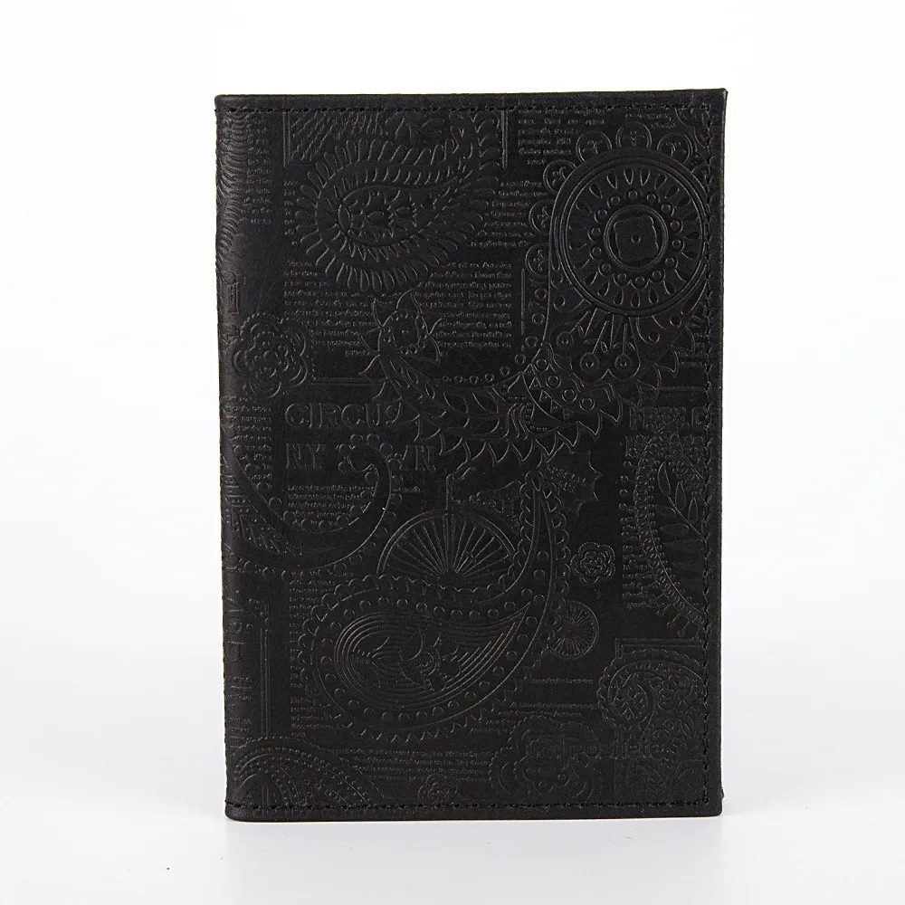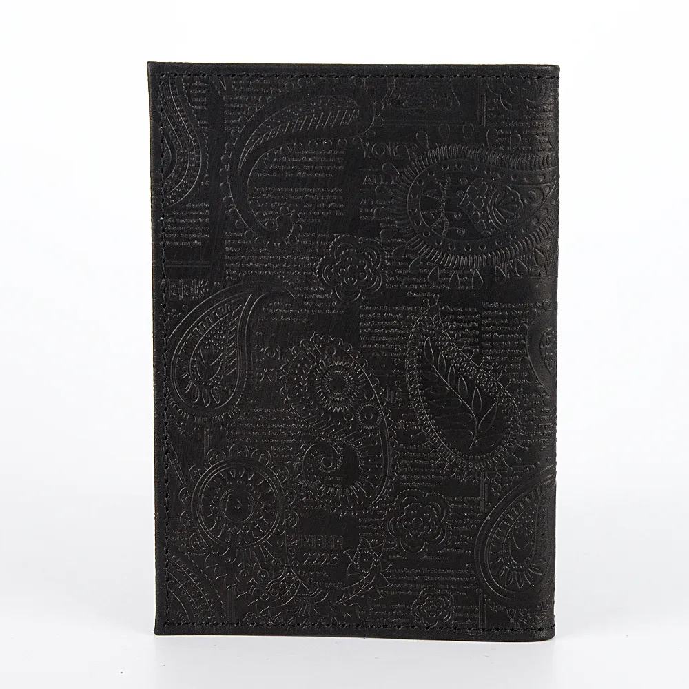 Обложка для автодокументов от торговой марки Poshete из натуральной кожи черного цвета. Декорирована оригинальным тиснением с цветочным орнаментом. Модель раскрывается книжкой. Внутри: блок из прозрачных файлов разного размера.